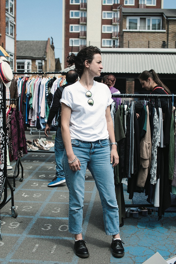 着心地と絶妙なフィット感の《MUJI》のTシャツは、ロンドンガールにも人気!シンプルな白Tシャツの袖はくるりと巻くって、女性らしさをオン。さりげないアクセサリー使いが、大人なこなれ感を醸し出す。