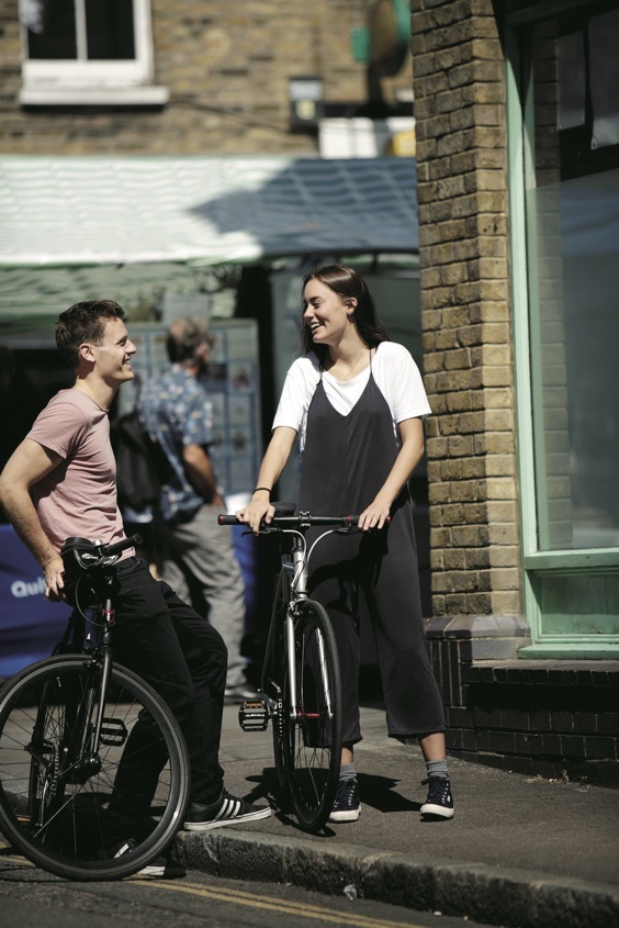 ほんのりフィット感のある《MUJI》のTシャツはオールインワンとの相性も抜群!毎週日曜日に開かれる、コロンビア・フラワーマーケットで見つけたカップル。彼も彼女も《MUJI》や《UNIQLO》をデイリーユース。