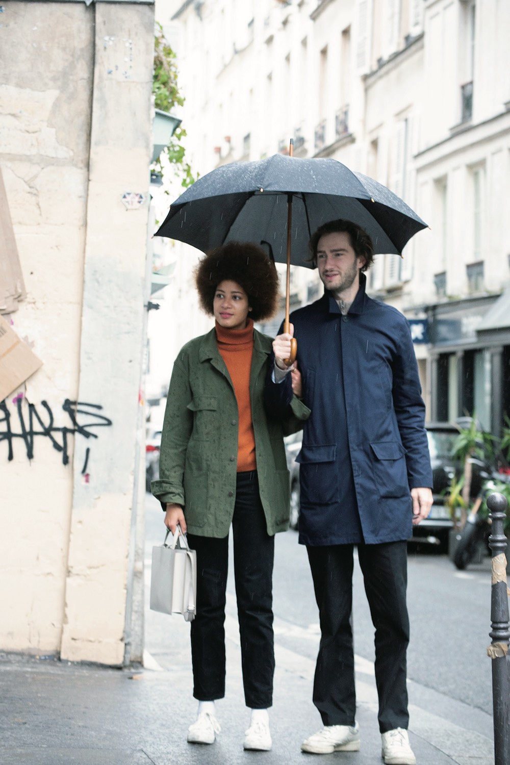 《MUJI》の撥水スニーカーは雨の日でも気兼ねなく履けて◎。足元を白スニーカーで合わせると一気に軽やかな印象に。大人な雰囲気の2人に抜け感をプラスして、さらにおしゃれ度UP!