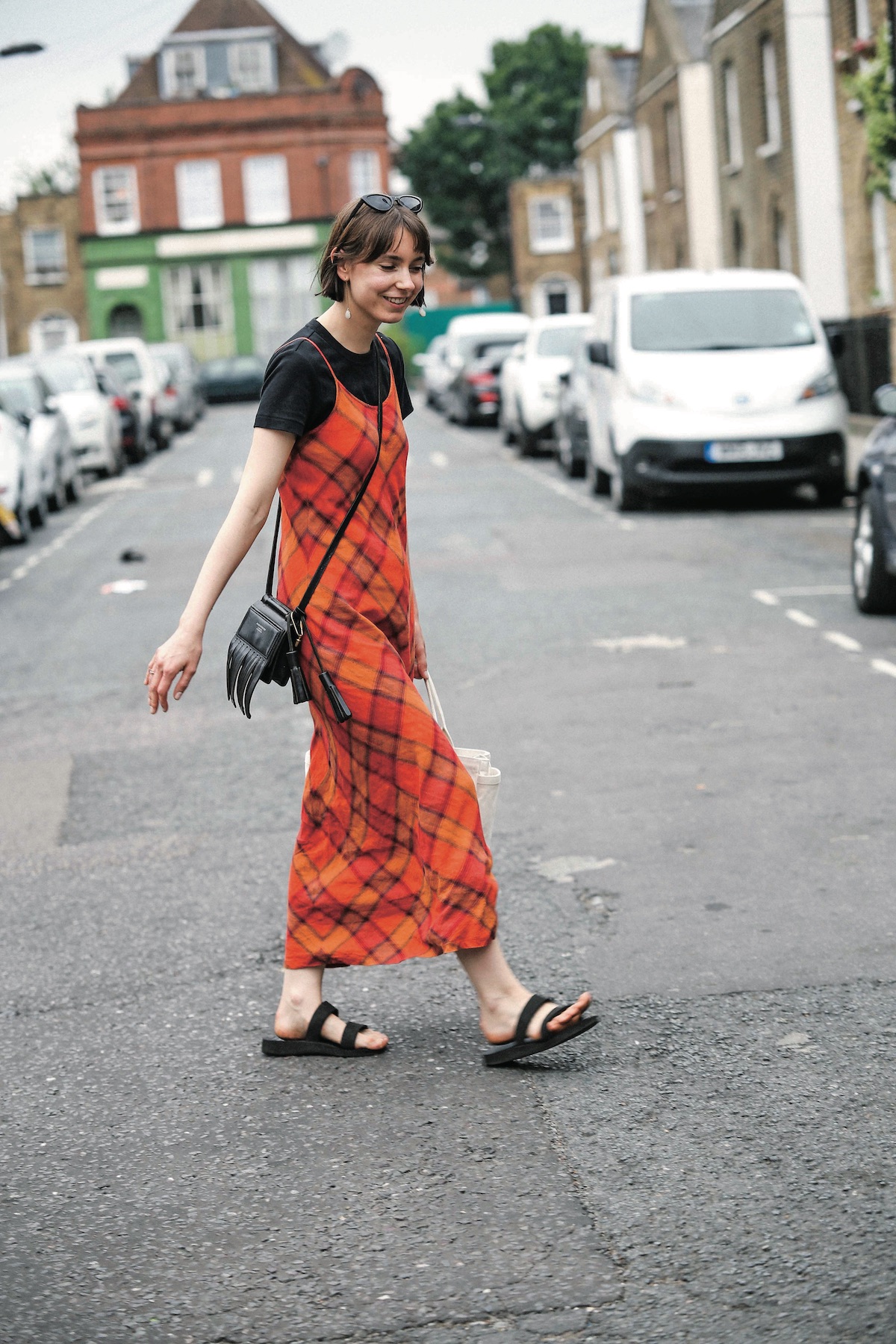 《MUJI》の機能的でシンプルなデザインは洗練されたロンドンガールにもぴったり。華やかなキャミワンピのレイヤードコーデの足元は《MUJI》の黒サンダルで引き締め。
