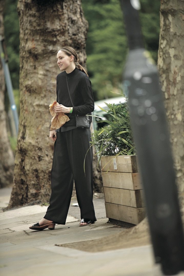名門校ロンドン・カレッジ・オブ・アートでメンズウエアのデザインを勉強中という彼女は、全身ブラックスタイルにタイトなヘアでクールな印象。夏らしい素材とミニマルな小物選びで洗練された着こなしが素敵だ。