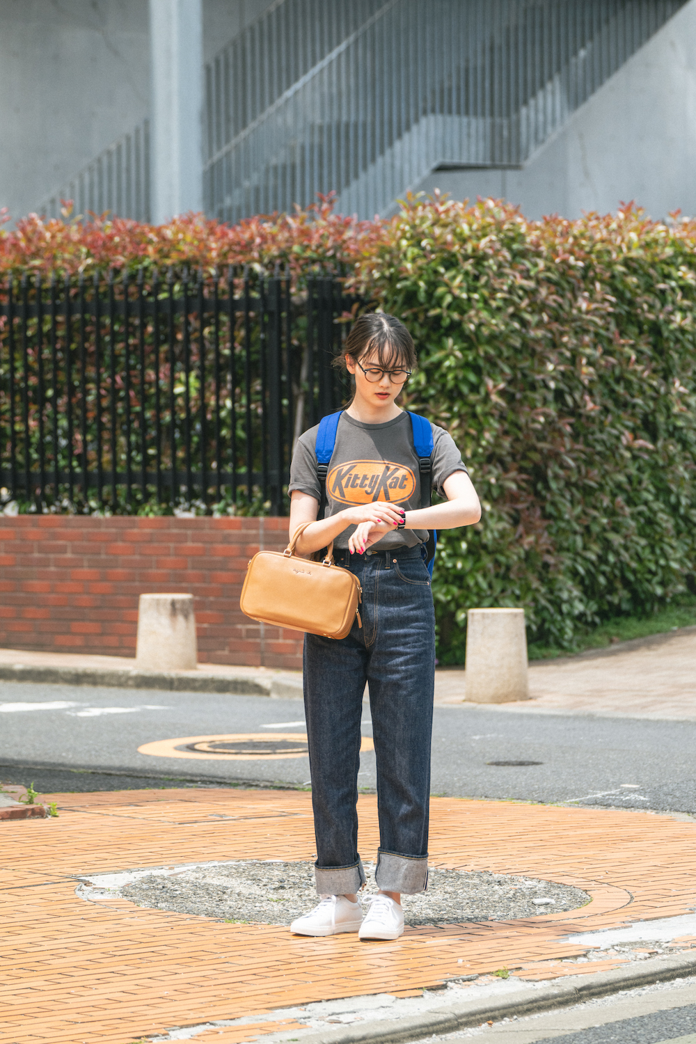 メガネ¥42900/EYEVAN (アイヴァン 東京ギャラリー)、時計¥17600/NAVAL WATCH(ザボウ 渋谷店)、デイパック¥14960/MidiUmi(マザーズインダストリー)、バッグ¥68200/agnès b.(アニエスべー)