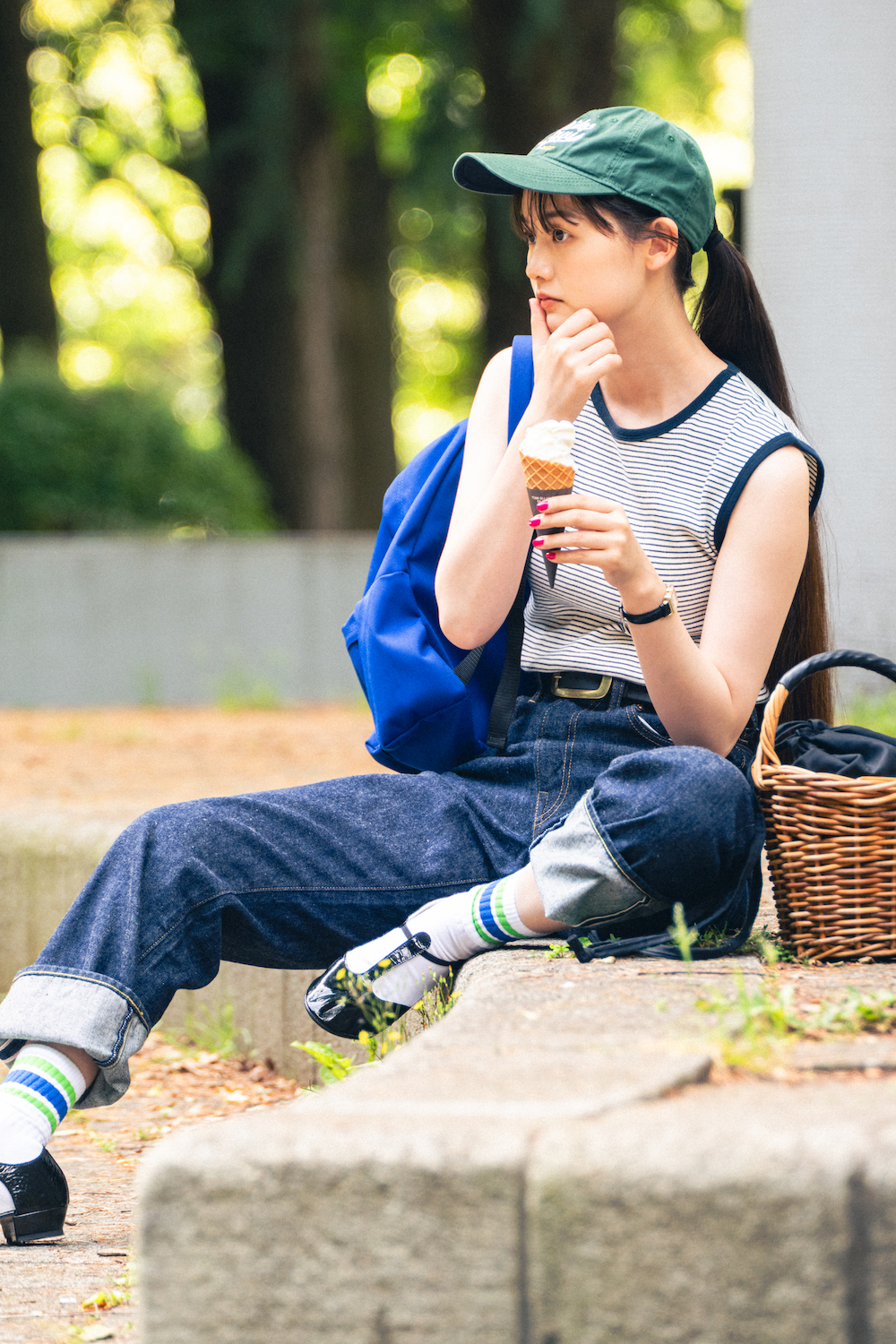 仕事が早く終わって、ちょっと寄り道していたら美味しそうなソフトクリームを発見。公園でひと休みしながらいただきましょう。こんな猛暑の日は、タンクトップとデニムパンツを合わせたヘルシーな着こなしに限ります。カゴバッグやパンプスでレディに味付け。さらにキャップやラインソックスでボーイッシュさもミックスすると、一気にこなれた雰囲気に仕上がります。