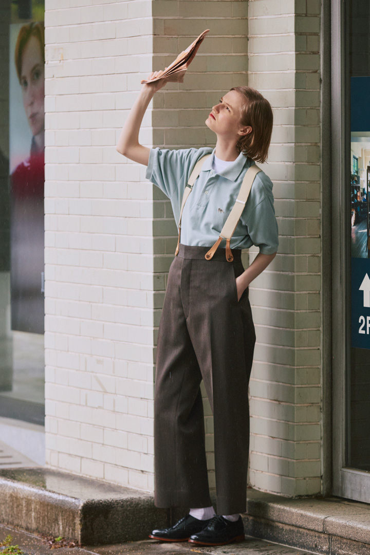 ポロシャツ¥17600/SCYE BASICS(マスターピースショールーム)、Tシャツ¥2420/Hanes(ヘインズブランズ ジャパン カスタマーセンター)、パンツ¥52800、サスペンダー¥12100/ともにHUM VENT(アルファ PR)、ソックス¥3630/PANTHERELLA(真下商事)、シューズ¥42900/REGAL(リーガルコーポレーション)