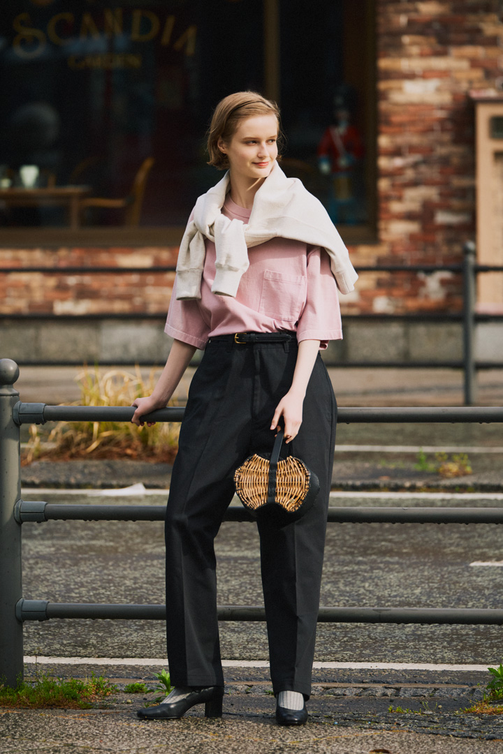 Tシャツ¥14300/blurhms ROOTSTOCK(ワンダリズム)、肩にかけたスウェットシャツ¥28600/HYKE(ボウルズ)、パンツ¥26400/HOLLYWOOD RANCH MARKET(ハリウッド ランチマーケット)、カチューシャ¥4950/IRIS47(フーブス)、ベルト¥14300/TORY LEATHER(メイデン・カンパニー)、バッグ¥68200/eb・a・gos(エバゴス)、ソックス¥3630/PANTHERELLA(真下商事)、パンプス¥24970/MACKINTOSH PHILOSOPHY(モーダ・クレア)