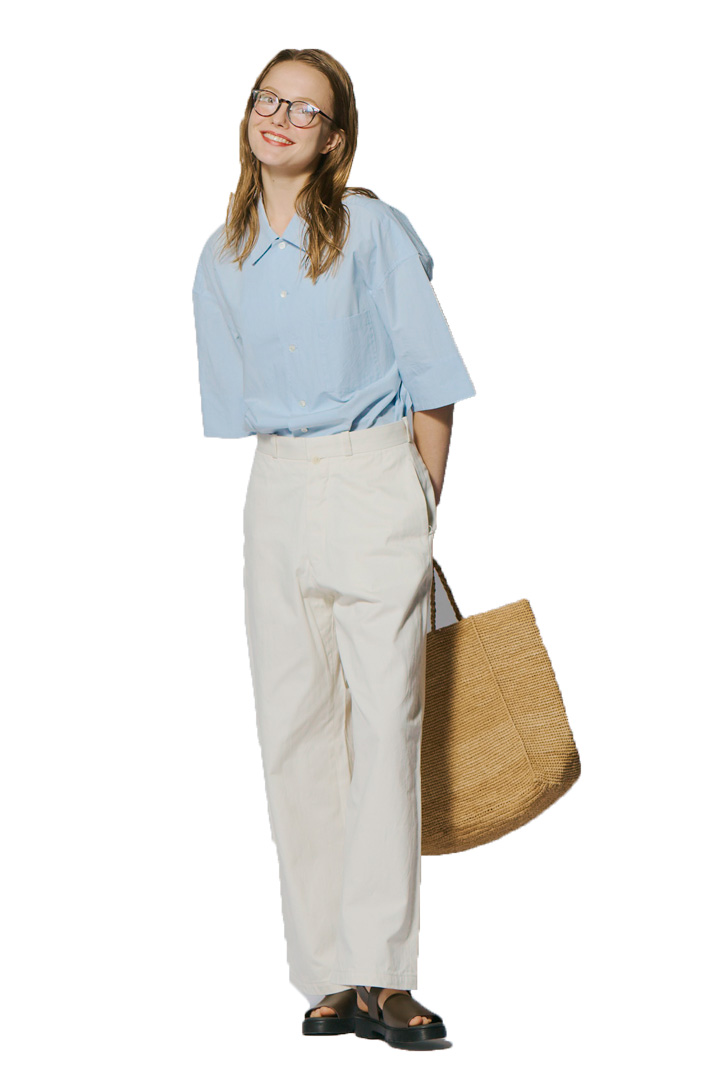 シャツ¥28600/UNDECORATED(アンデコレイテッド)、パンツ¥25300/YAECA(ヤエカ アパートメント ストア)、メガネ¥62810/Oliver Peoples(ルックスオティカジャパン カスタマーサービス)、バッグ¥47300/NORO(グラストンベリーショールーム)、サンダル¥19910/MARGARET HOWELL idea(モーダ・クレア)