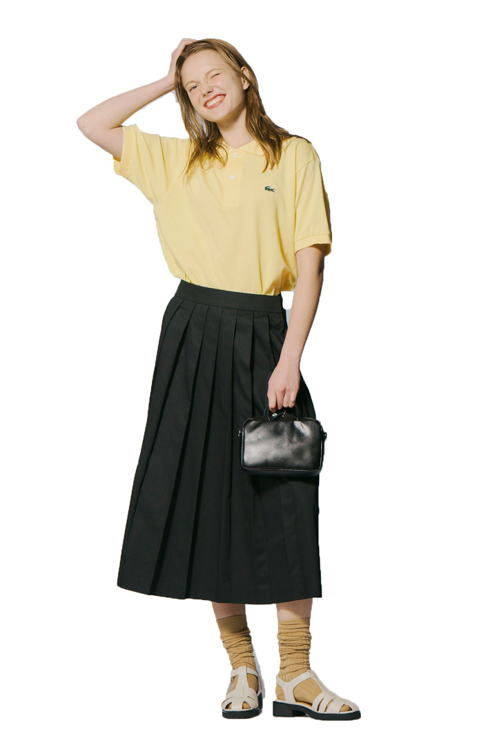 ポロシャツ¥17600/LACOSTE(ラコステ お客様センター)、スカート¥23100/LACOSTE × BEAMS BOY(ビームス ボーイ 原宿)、バッグ¥17600/TIDEWAY(タイドウェイ 原宿店)、ソックス¥4290/PANTHERELLA(真下商事)、サンダル¥24970/MACKINTOSH PHILOSOPHY(モーダ・クレア)