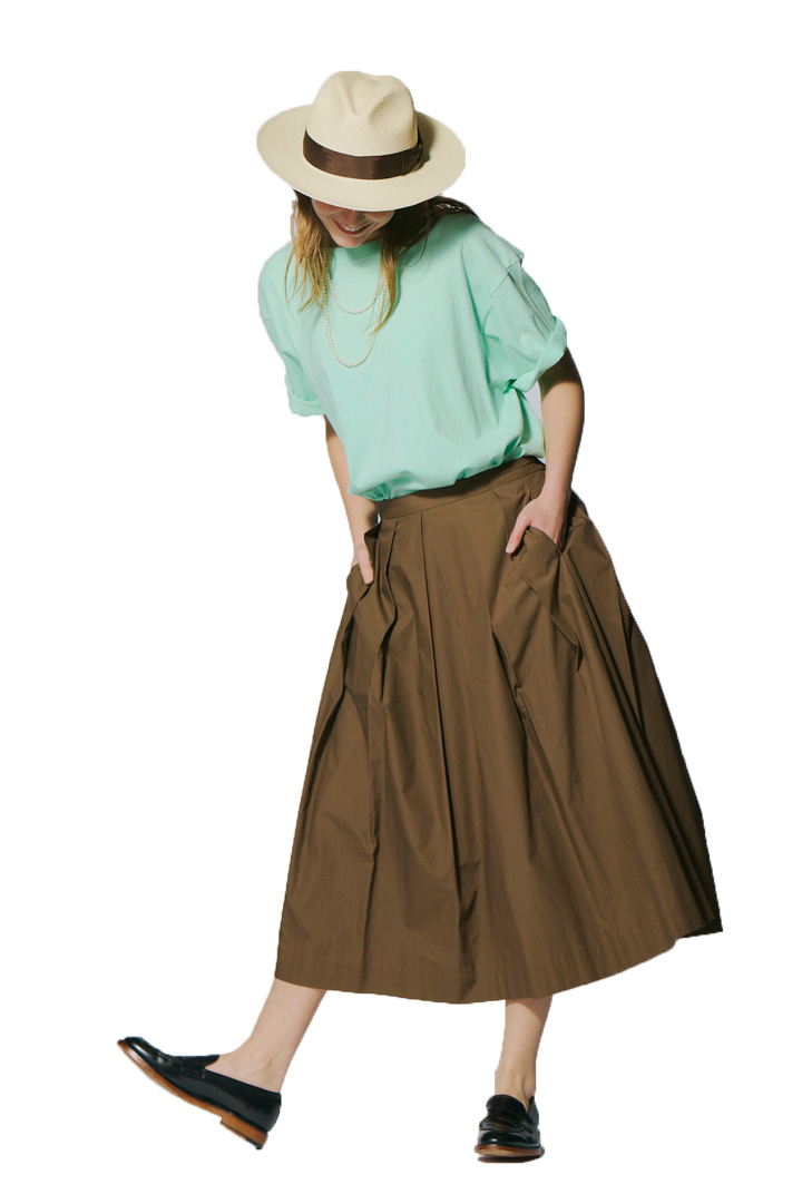 Tシャツ¥1496/United Athle(キャブ)、スカート¥44000/JOHN SMEDLEY(リーミルズ エージェンシー)、ハット¥28600/STETSON(ステットソン ジャパン)、ネックレス¥57200/CHERRY BROWN(チェリーブラウン)、シューズ¥42900/REGAL(リーガルコーポレーション)
