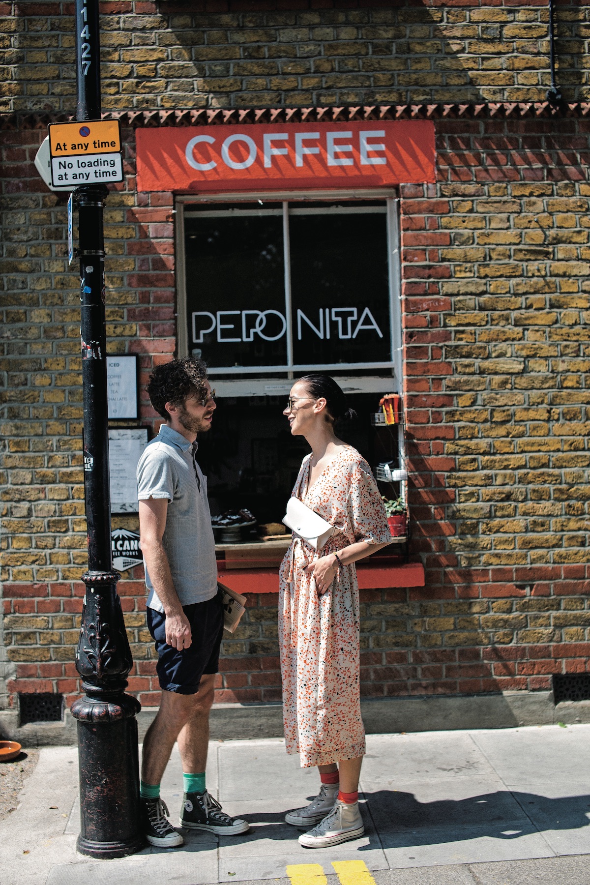 ワンピースに散りばめられた、ヴィヴィッドなオレンジのグラフィカル柄が装いをリズミカルに彩る。さらに柄のオレンジをソックスでも拾い、足元にもカラーコーディネートを仕掛けたら、フレッシュな統一感が生まれる。分なの。