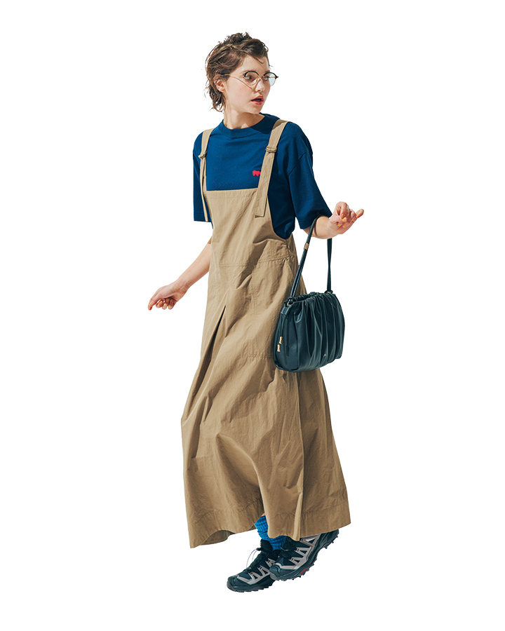 アームが大きく空いたエプロンワンピースには、ゆったりシルエットのT シャツを合わせるのがバランスよく仕上げるコツ。ワンピースが中間色の場合は、それよりも濃い色のT シャツを選んで全体を引き締めて。