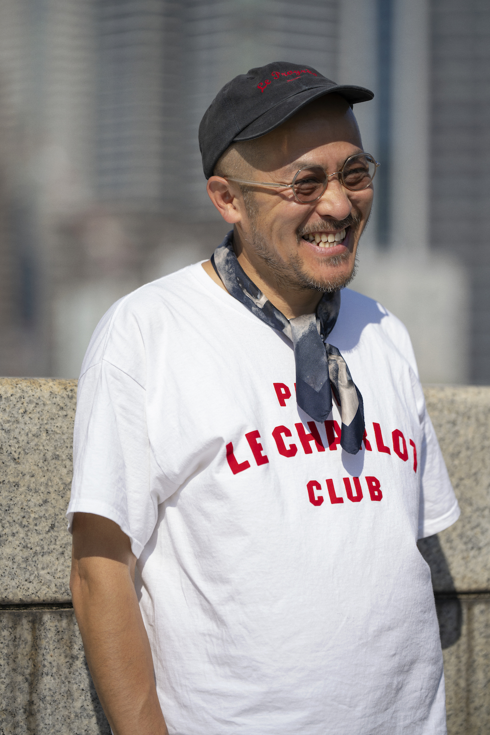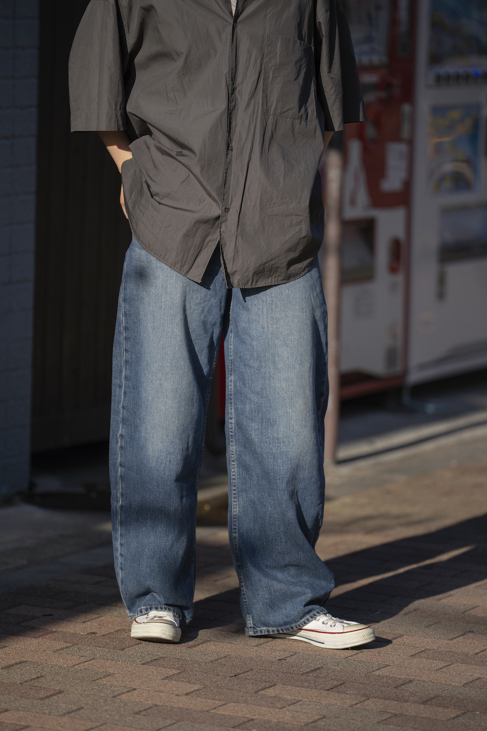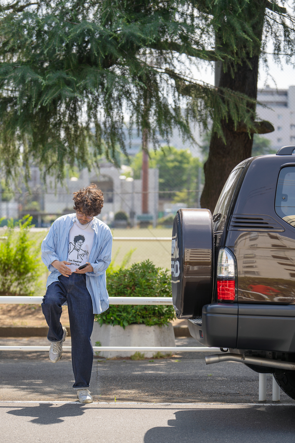 カンタンに真似できそうで真似できない、自然体でいながら絶妙なバランスに思わず目を止めてしまう田村さんのスタイル。その秘訣、知りたくなります。 「最近はファッションというより、自分らしさを大切にしています。改めて昔に立ち返っている感じで、ファッション以外の自分の好きなものをスタイルに混ぜていくのが気分になっています」 野暮ったくならないようにインナーはタックイン、ただ抜け感は欲しいのでシャツはオーバーサイズを選んで軽やかさを意識。このスタイルなら革靴も合うけれど、蒸し暑い気候ならスニーカーで軽さを出した方がいいといいます。Tシャツは自分の好きな音楽やアートのものを着ることが多いという田村さん。 「ナイジェル・グラフのイラストTシャツ。トム・ウェイツというのがいいなと思って買ったものです。自分らしさの出るアイテムと、スタンダードなジーンズを合わせました」 「このJWAストレートはキレイめのアメカジもいける、とても守備範囲が広い印象。普遍的ですよね、ジーンズの入り口としても使いやすいと思います。まず廃れないですよね。男女問わず穿けるし、女性が大きめサイズをボーイフレンドデニムのように穿きこなすのもかわいいと思います」