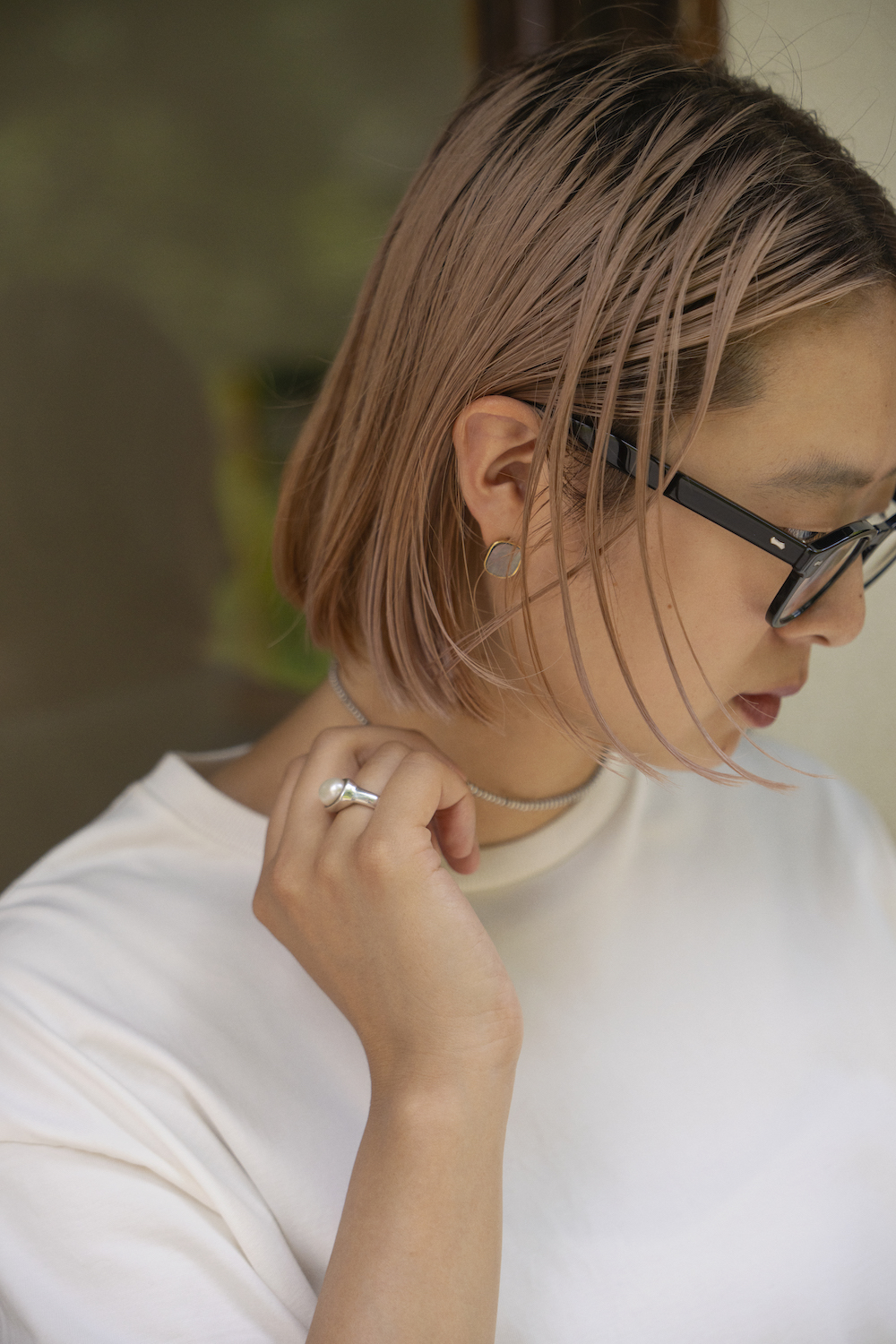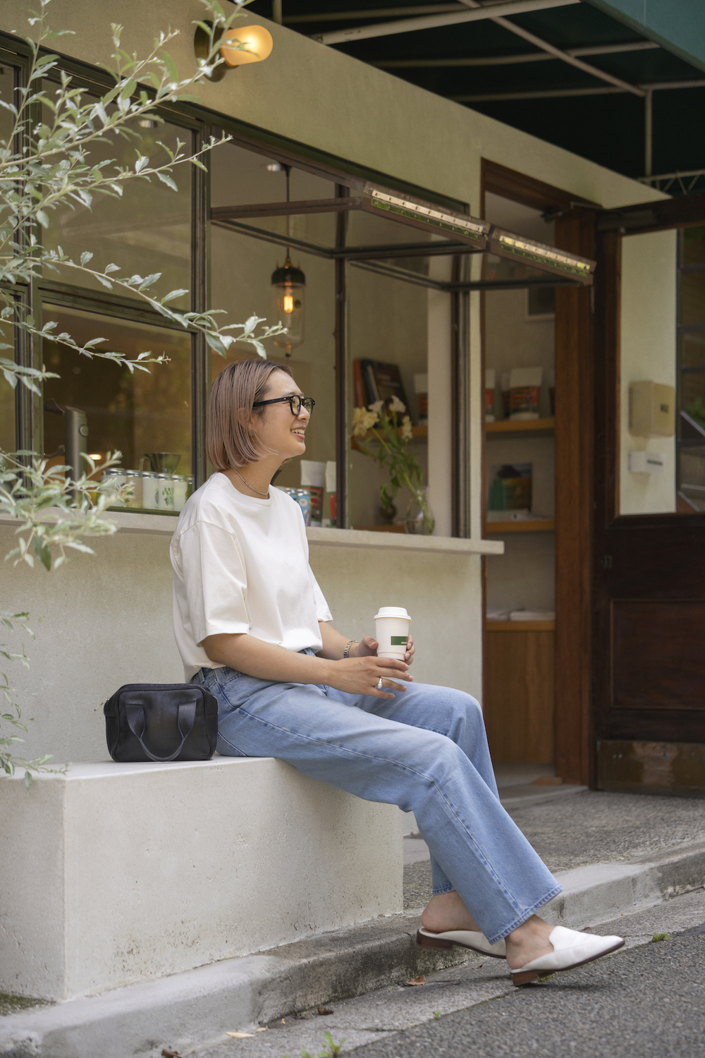 自らディレクションするギャラリーはHITSU COFFEE STANDと隣り合わせで、休憩時間はもっぱら香り高いコーヒーが相棒だという北川さん。白Tee×ジーンズという超王道スタイルにも洗練された抜け感があります。 「ジーンズはJWAストレートの1サイズ大きめを選びました。太すぎず細すぎず、ちょうどいいバランスで、無理なく自然な落ち感がいいですね」 夏らしいライトカラージーンズに、シルエットにこだわり抜いたという自身が手がけた白Tシャツ。パターンの優れたアイテムなら、ここまでシンプルなコーディネートも生かせることの証左かも。カジュアルに振りすぎないよう足元にはレザーを選び、ミュールサンダルで軽さを出す引き算のテクニック。ピアスやネックレス、リング、ウォッチといったアクセサリーで、シンプルスタイルにリズムと洗練を引き出しているのもポイントです。