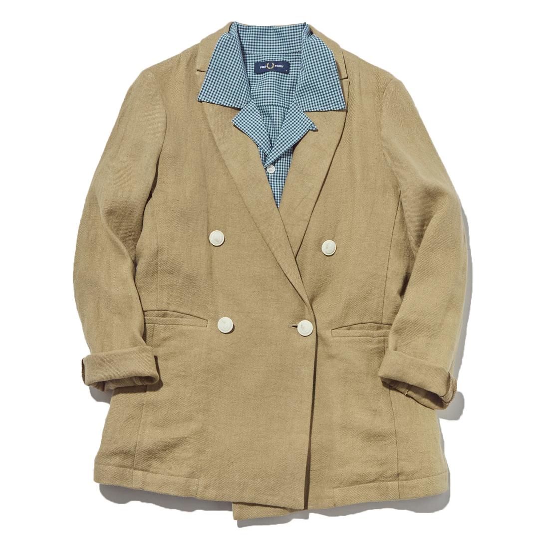 リネンジャケットをサラッと羽織って、きちんと感をプラス。明るいベージュを選んだことで爽やかにまとまり、今の季節と気分にぴったり。ポロシャツ+スカーフという紳士的なディテールもGOOD!