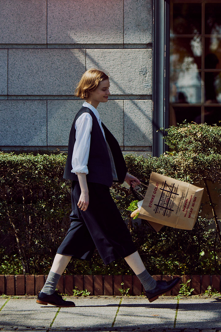 シャツ¥20900/YAECA(ヤエカ アパートメント ストア)、ベスト¥27500/THE SHINZONE(シンゾーン ルミネ新宿店)、ショートパンツ¥29700/SOFTHYPHEN(ソフトハイフン)、バッグ¥29700/L’Avenir( ディー・エル・ティー)、ソックス¥3630/PANTHERELLA(真下商事)、シューズ¥42900/REGAL(リーガルコーポレーション)
