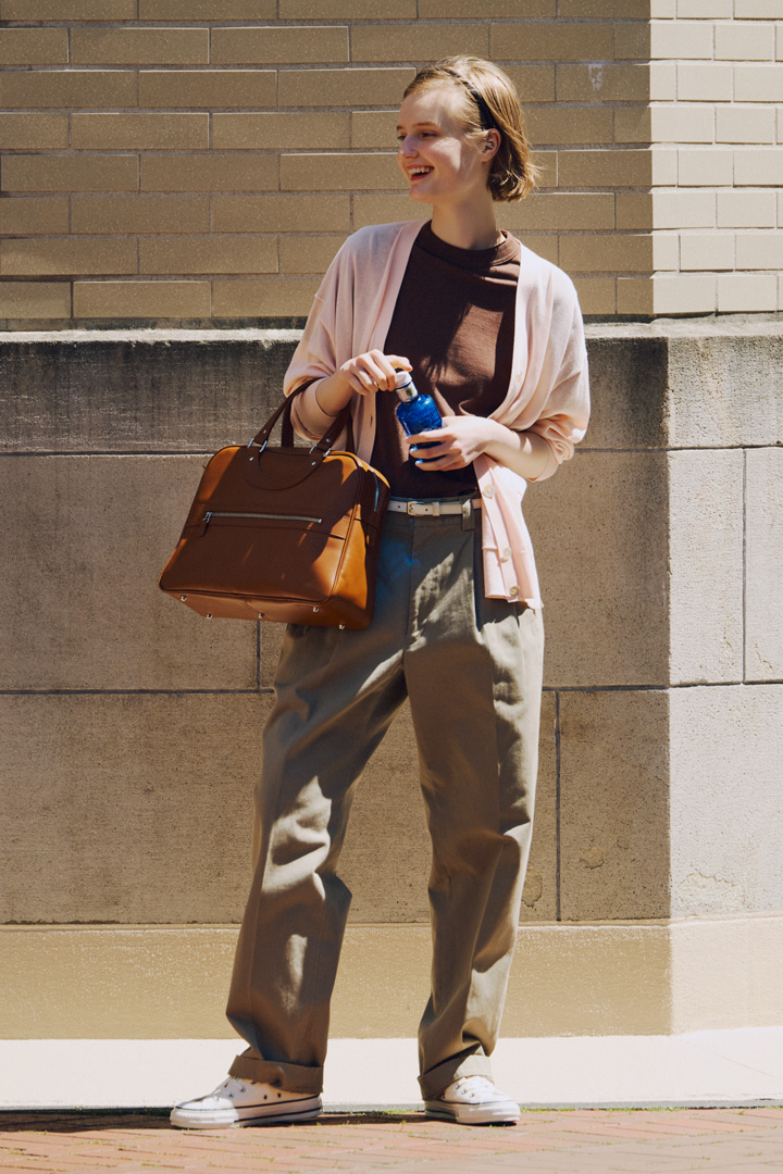 カーディガン¥19800/MICA & DEAL(マイカアンドディール 恵比寿店)、Tシャツ¥4180/BEAMS BOY(ビームス ボーイ 原宿)、パンツ¥29480/Oblada(シンチ)、カチューシャ¥6050/IRIS47(フーブス)、ベルト¥5280/BEAUTY&YOUTH(ユナイテッドアローズ 渋谷スクランブルスクエア店)、バッグ¥126500/JACQUES LE CORRE(アッシュ・ペー・フランス)、スニーカー¥9900/CONVERSE(コンバースインフォメーションセンター)