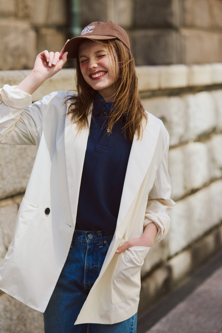 ジャケット¥61600/BEIGE(, オンワード樫山お客様相談室)、ポロシャツ¥15400 /HOLLYWOOD RANCH MARKET(ハリウッド ランチ マーケット)、デニムパンツ¥23980/orslow × BEAMS BOY(ビームス ボーイ原宿)、キャップ¥5940/HANDTEX(ユナイテッドアローズ 渋谷スクランブルスクエア店)、スカーフ¥24200/A Piece of Chic(グラストンベリー ショールーム)