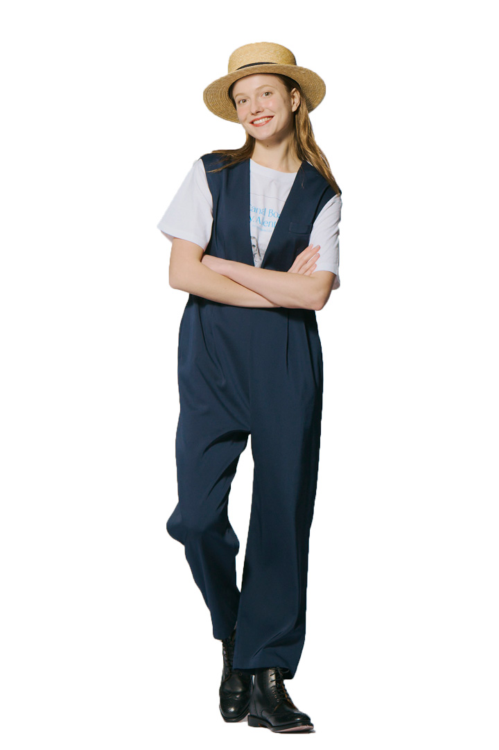ジャンプスーツのシャープなシルエットや、カンカン帽、レザーブーツなどの上品小物が、Tシャツをアップグレードしてる。