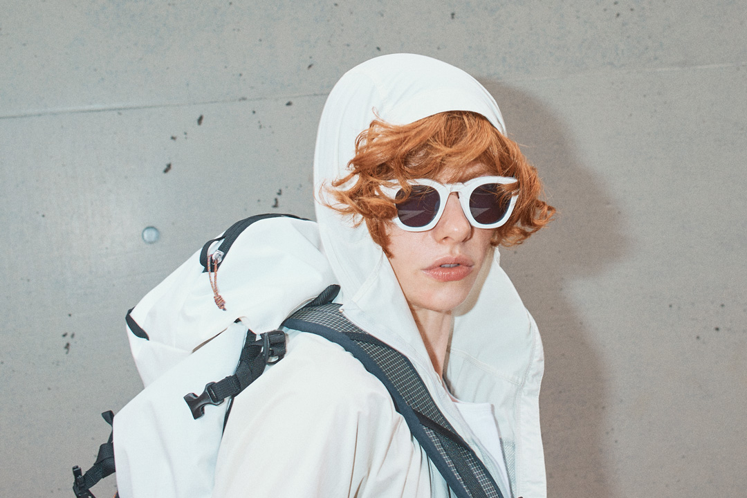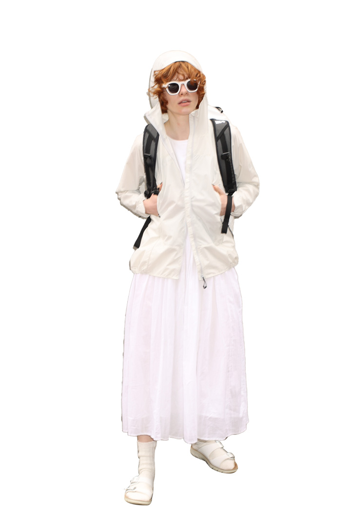 テック系アイテムをタウン仕様に昇華できるのも、ホワイトの特権。軽やかなワンピースに重ねて、素材でリズミカルな抑揚をつけたら、あらモダン! サングラスや足元で、楽しい抜け感も演出してみる。
