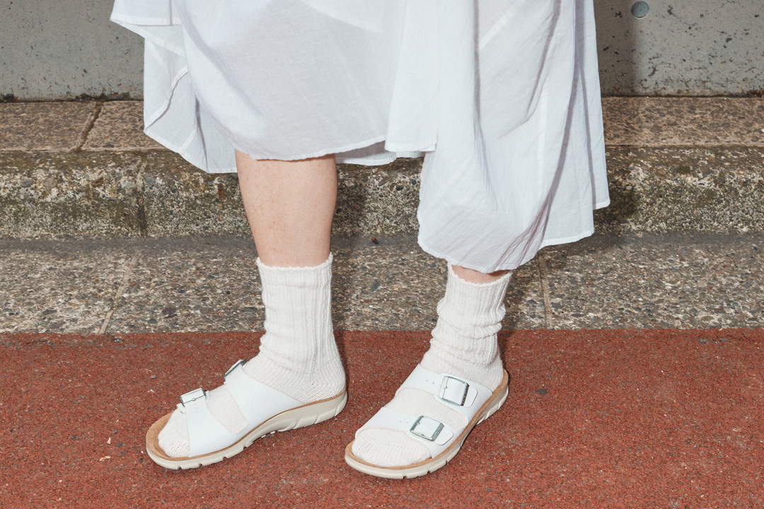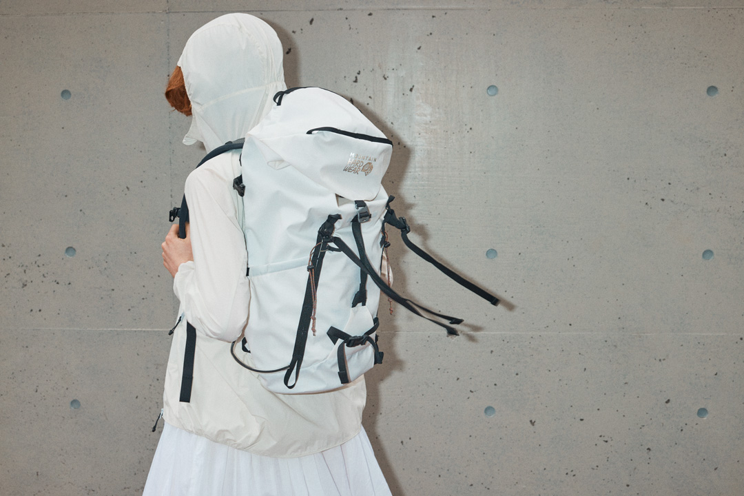 ジャケット¥20900/MILLET(ミレー・マウンテン・グループ・ジャパン・カスタマーサービス)、ワンピース¥31900/maison de soil(メゾンドソイル恵比寿店)、サングラス¥50600/pine(フォレストパイン・デザインラボ)、バックパック¥26400/Mountain Hardwear(コロンビアスポーツウェアジャパン)、ソックス¥3300/YAECA(ヤエカアパートメントストア)、サンダル¥13200/BIRKENSTOCK(ヤエカホームストア)