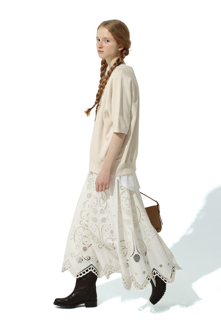 ブーツ¥42500/TOUT Y EST(トゥティエ)、スウェットシャツ¥22000/Champion(ヘインズブランズジャパン カスタマーセンター)、タンクトップ[6月上旬発売予定]¥7920/GALLEST(ワールド プレスインフォメーション)、スカート¥39600/THE SHINZONE(シンゾーン ルミネ新宿店)、バッグ¥74800/A.P.C.(アー・ペー・セー カスタマーサービス)