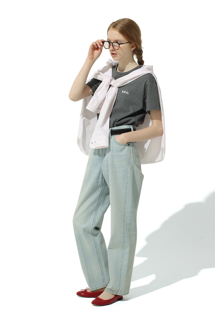 シューズ¥57200/Repetto(ルック ブティック事業部)、Tシャツ¥22000/A.P.C.(アー・ペー・セーカスタマーサービス)、肩にかけたシャツ¥29700/nanamica(ナナミカ D.W.S.)、デニムパンツ¥19800/Lee(エドウイン・カスタマーサービス)