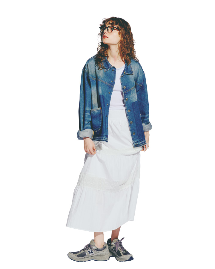 カバーオール¥73700/Andersson Bell(グリニッジ ショールーム)、スカート¥10450 /I LLI GO(ハナ コリア)、スニーカー¥19800/ New Balance(ニューバランスジャパンお客様相談室)、その他/スタイリスト私物