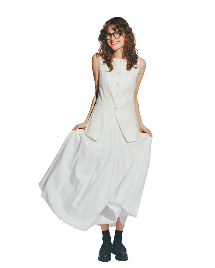 ベスト¥31900、スカート¥33000 /ともにKUMÉ(クメ)、シューズ¥94600 / Paraboot (パラブーツ青山店)、その他/スタイリスト私物