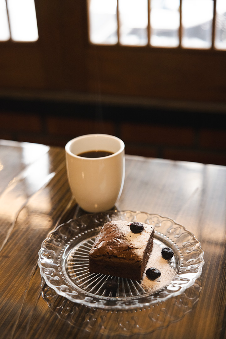 60年代のコーヒークラブを彷彿とさせる店内には、壁一面の本や、店主がコレクションしたレコードがずらり。ジャンル問わず、さまざまな国の音楽と本に囲まれた、アートカルチャーの温度が感じられるこの場所は、詩人であり音楽家のキム・サンウさんと、デザイナーのイ・ジュヨンさんが経営する喫茶店。おすすめは、サクサク、ほろほろ、しっとりの三拍子が揃う自家製のブラウニー(W6000)と、すっきり爽やかなアメリカーノ(W5500)のペアリング。