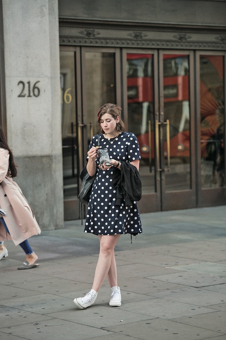 可憐な柄と色合いのワンピースには、カジュアルなエッセンスを加えるバランスが重要。ローテクスニーカーならモードになりすぎず、程よい抜け感づくりにひと役買ってくれる。