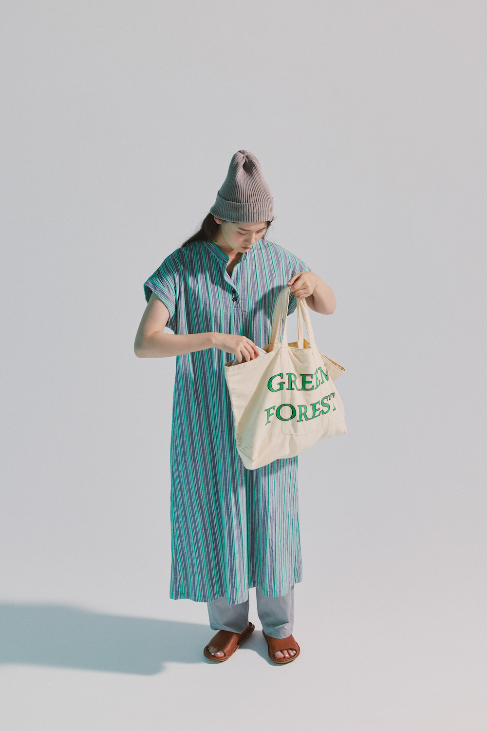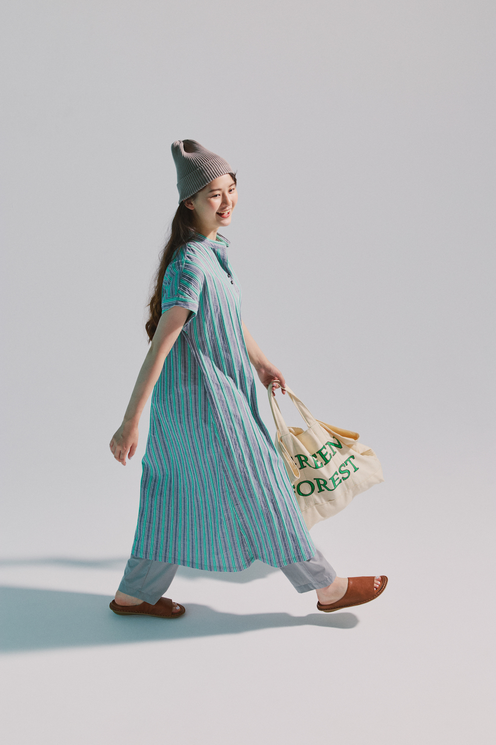 汗をかいてもさらっと肌離れの良いシアサッカー素材のワンピースは、暑い夏の味方。一枚で着るのも良いけれど、あえて同じトーンのイージーパンツをIN。このリラックス感のある重ね着が今の気分!ワンピースはスキッパー襟を選ぶと、グッと抜け感が生まれておすすめです。アクセントにロゴバッグやニット帽を。