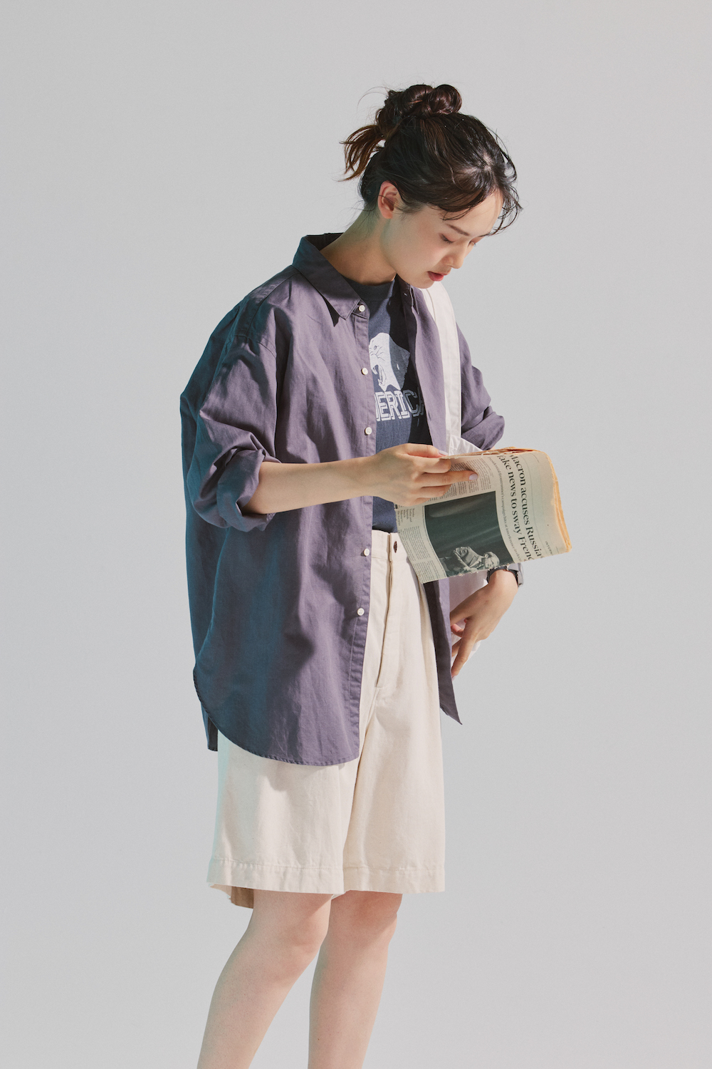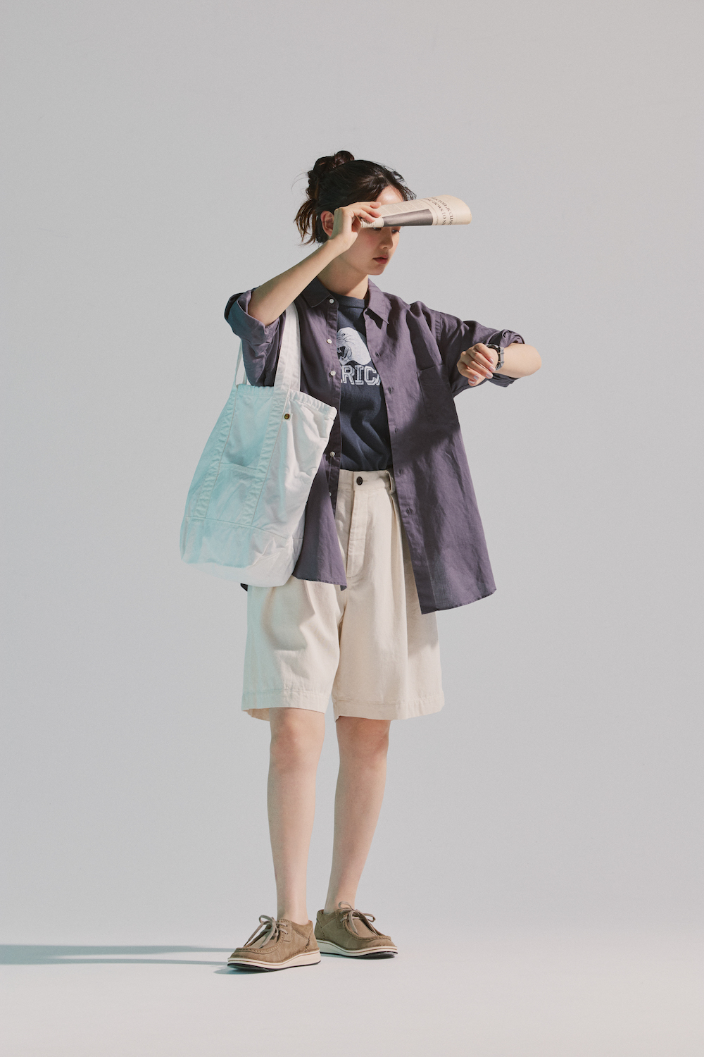 シャツ¥33000/CIOTA(シオタ)、Tシャツ¥13200/Americana×JEANS FACTORY(ジーンズ ファクトリー 卸団地本店)、ショートパンツ¥20900/UpcycleLino BASIC(ネストローブ 渋谷店)、時計¥17600/NAVAL WATCH(ザボウ 渋谷店)、バッグ¥10780/MASTER&Co.(マッハ55リミテッド)、シューズ¥28600/BIRKENSTOCK(ビルケンシュトック・ジャパン カスタマーサービス)