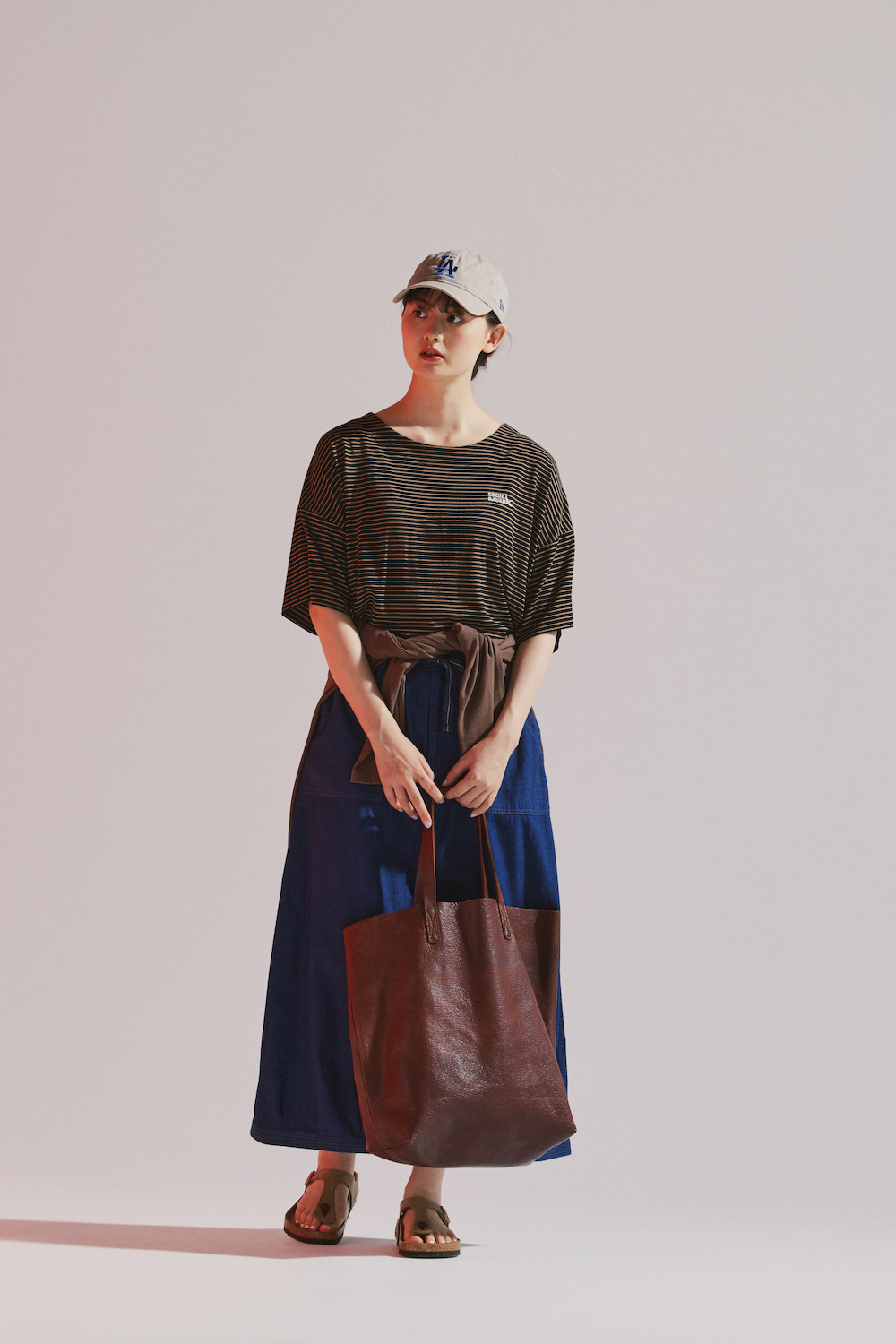 真夏もデニムスカートが履きたい!そんな時は軽量で柔らかく、風をはらんでふわっと揺れるライトオンスを選びましょう。例えばこの《オムニゴッド》の7.5オンスのデニムスカート。前後についた大きめのベイカーポケットが良いアクセントに。ブラウン×ブラックのシックなボーダーで洒落感を加えて。腰に巻いたシャツでシルエットに緩急を。
