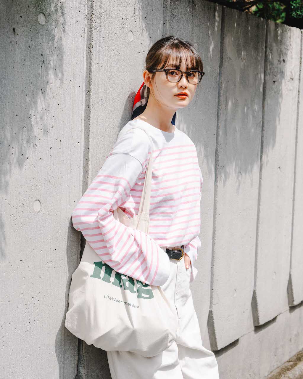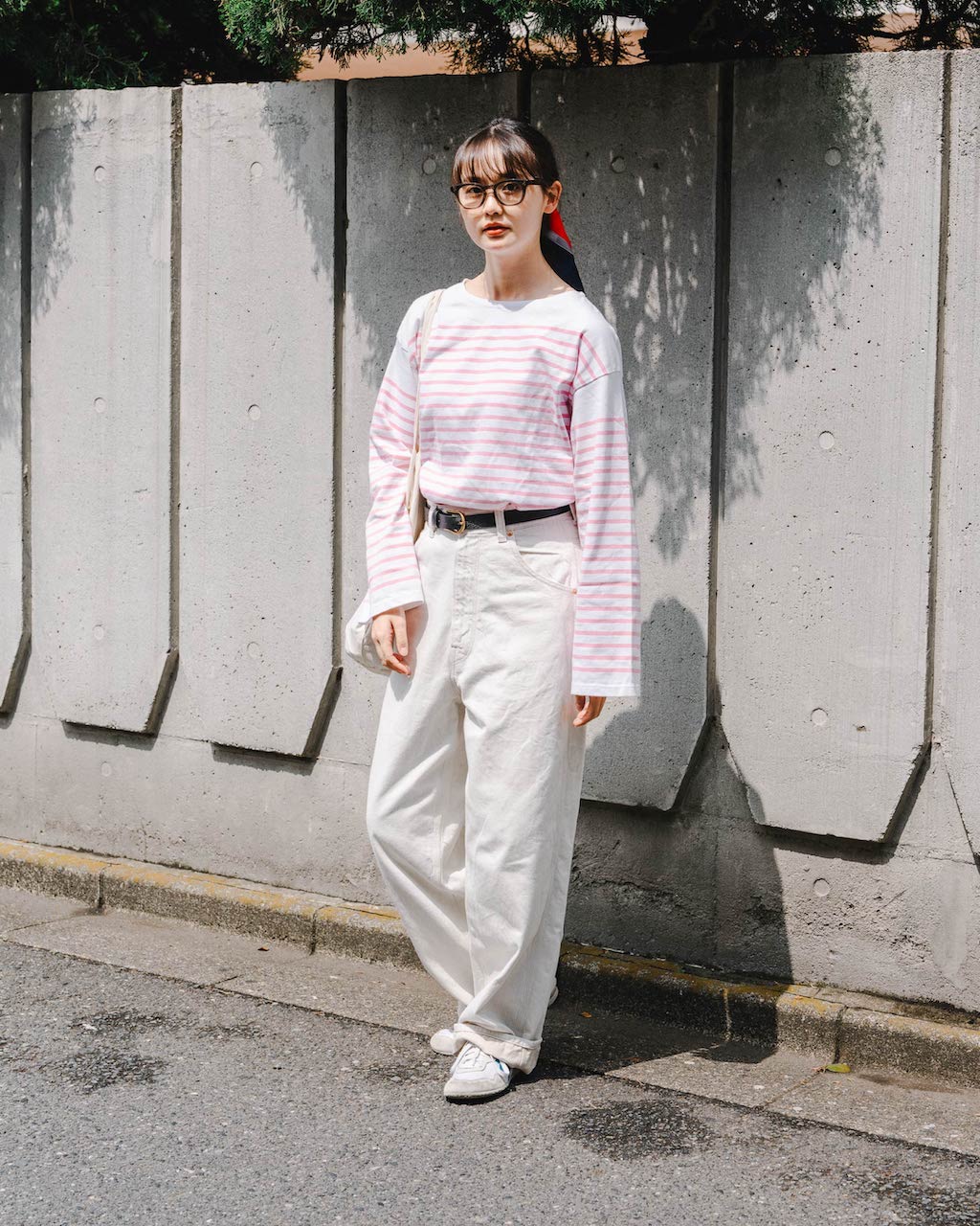 ホワイト&ピンクのボーダーTにホワイトデニムを合わせた爽やかなスタイリング。黒小物で引き締めつつ、存在感のあるスカーフを髪に巻いて印象的な装いに。