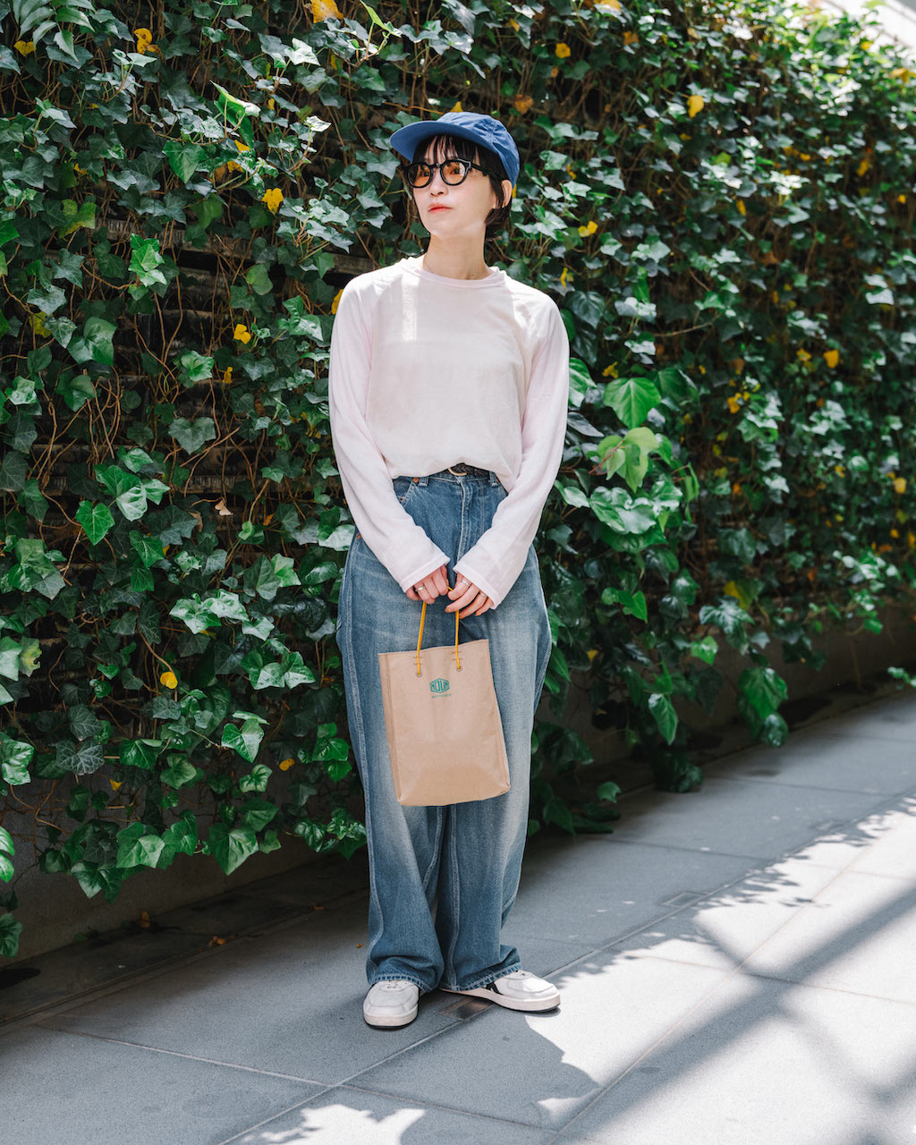 無地のロンT&ブルーデニムは初夏に最適。ブルーキャップやオレンジサングラス、カジュアル&軽やかな素材感のバッグで、ハイセンスな夏の着こなしにアレンジ!