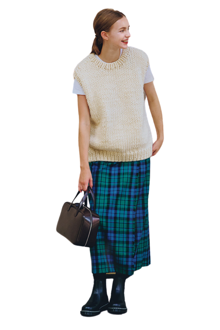 スカートのグリーンやブルーの発色が綺麗だから、他のアイテムはベーシックカラーで整えよう。トップスは、Tシャツ×もこもこニットベストくらいが丁度いい。だって秋だもの。