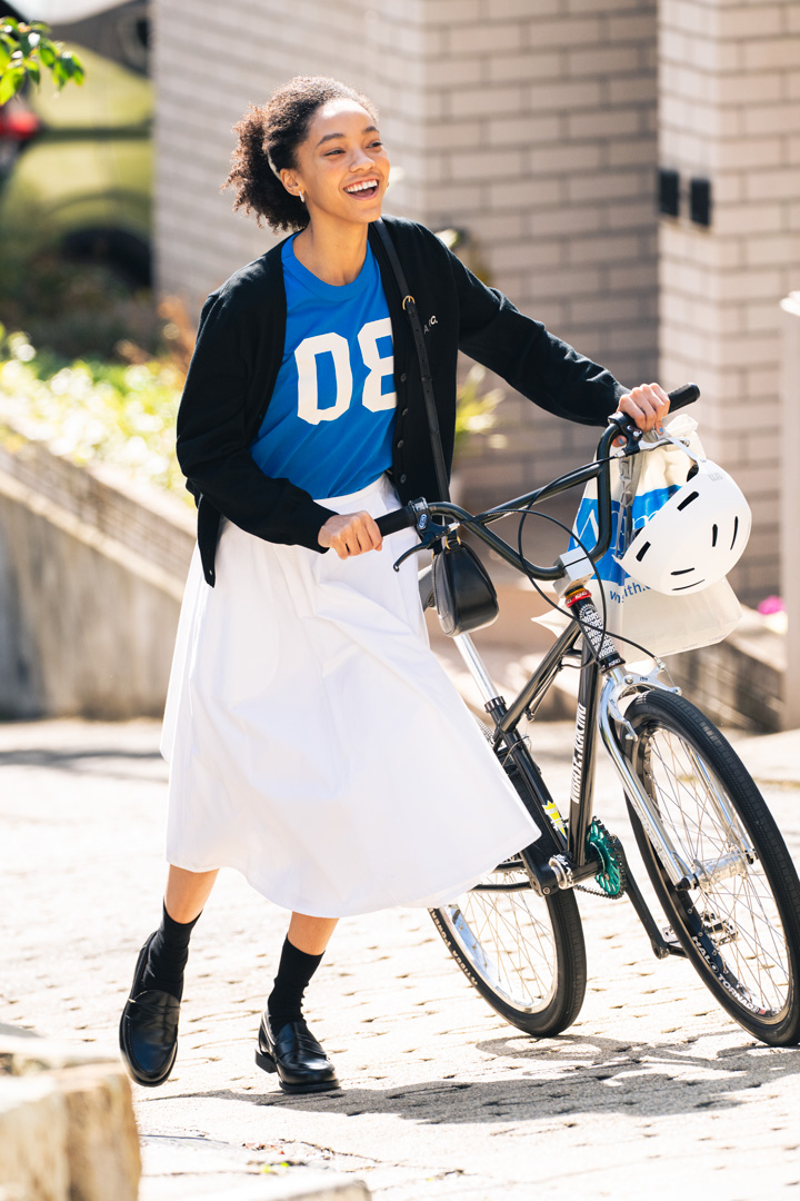 ほんのり透け感のある軽い素材で、たっぷり生地を使っているから着心地がいい《トゥジュー》のスカート。レディなアイテムだけど、キャップやロゴTシャツ、スニーカーと一緒にスポーティに着こなすのもいいよね。
