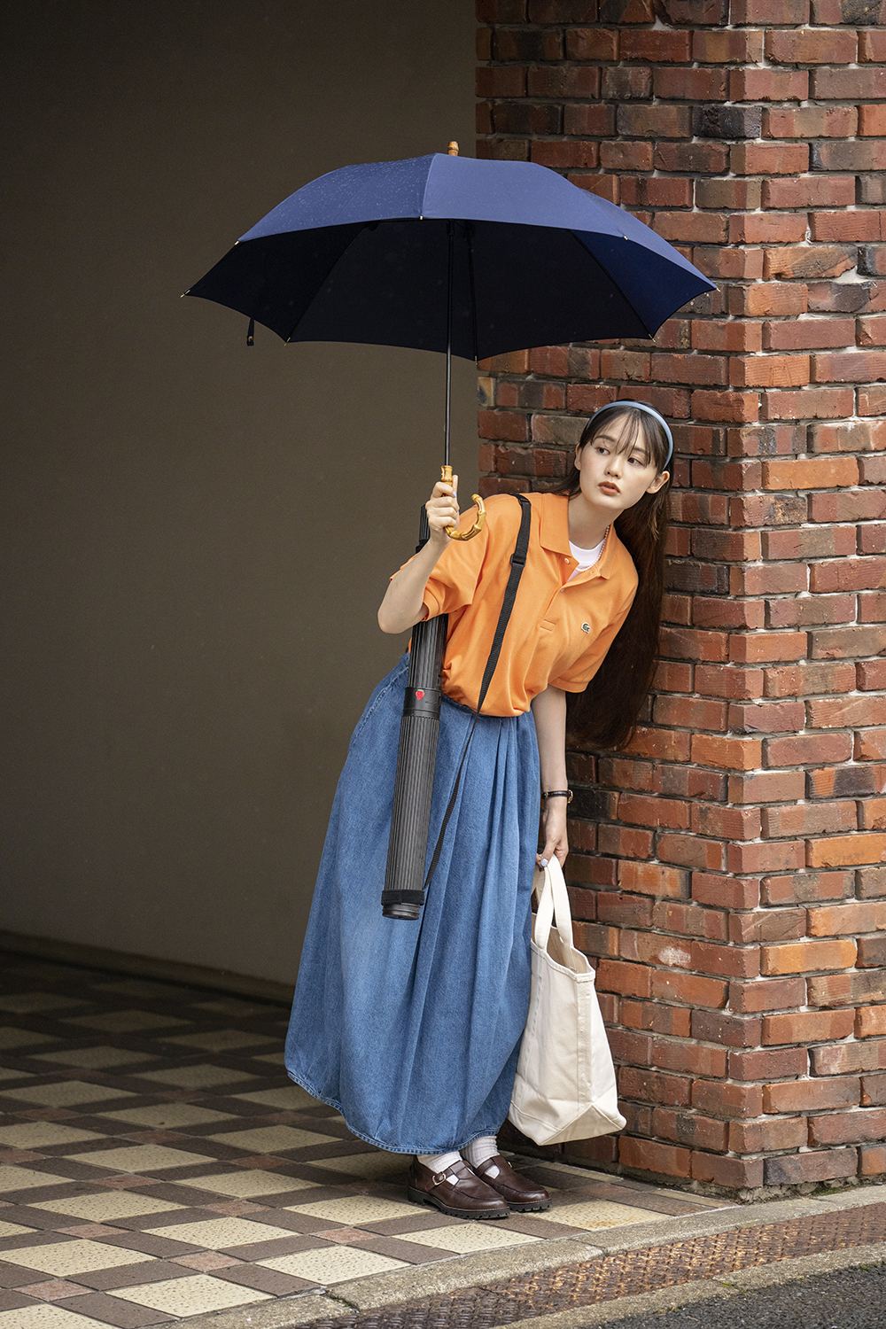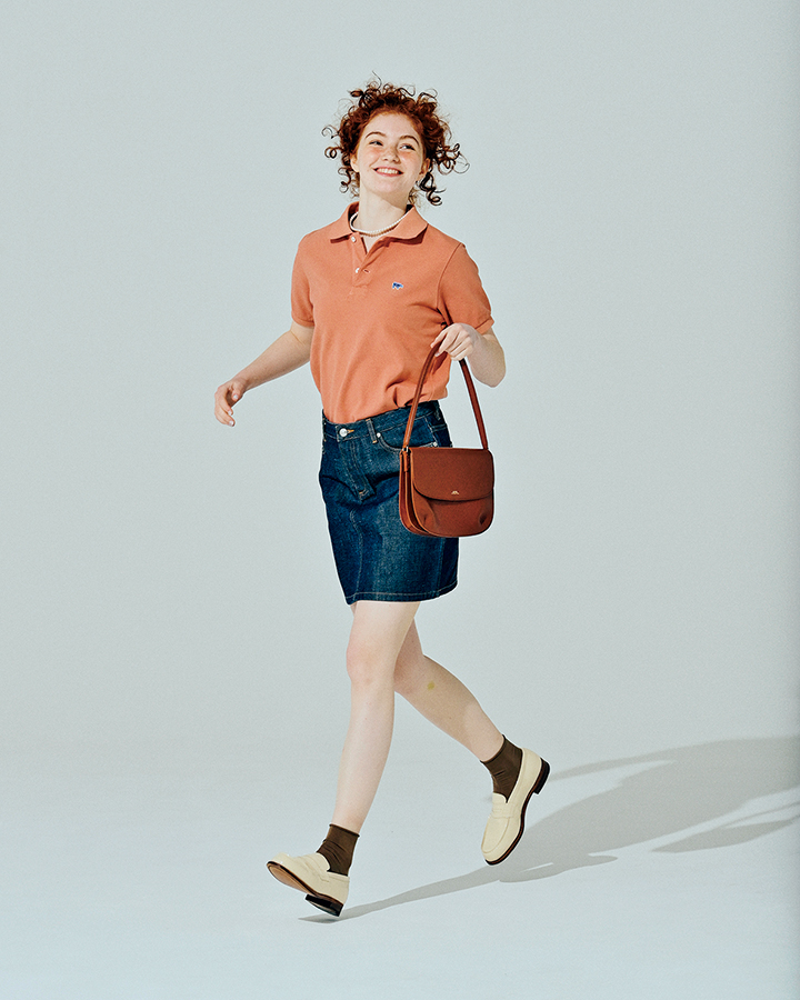 ボリュームのあるシルエットが可愛らしさを放つデニムスカートに、眩しいオレンジのポロシャツがワンポイント。レディとスポーティのバランスがちょうど良く、レザーのストラップシューズがコーディネートを引き締めてくれる。