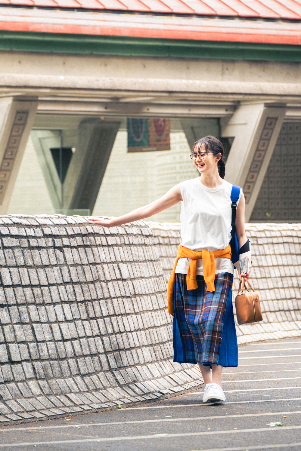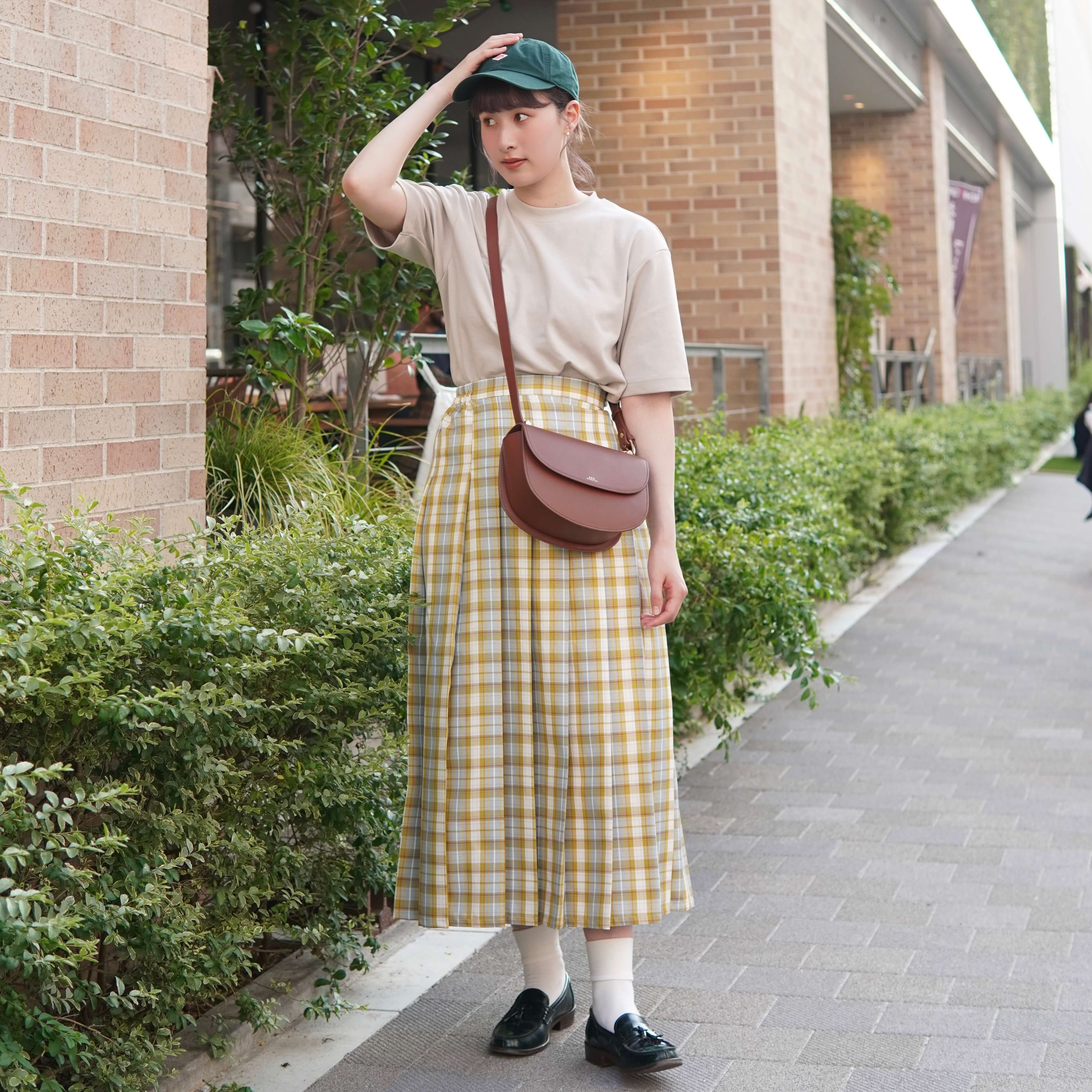 夏に合わせるのはエネルギッシュなイエローのチェックがベスト。グッドガールなプリーツスカートは、キャップやTシャツでカジュアルに着るのがマイルール。