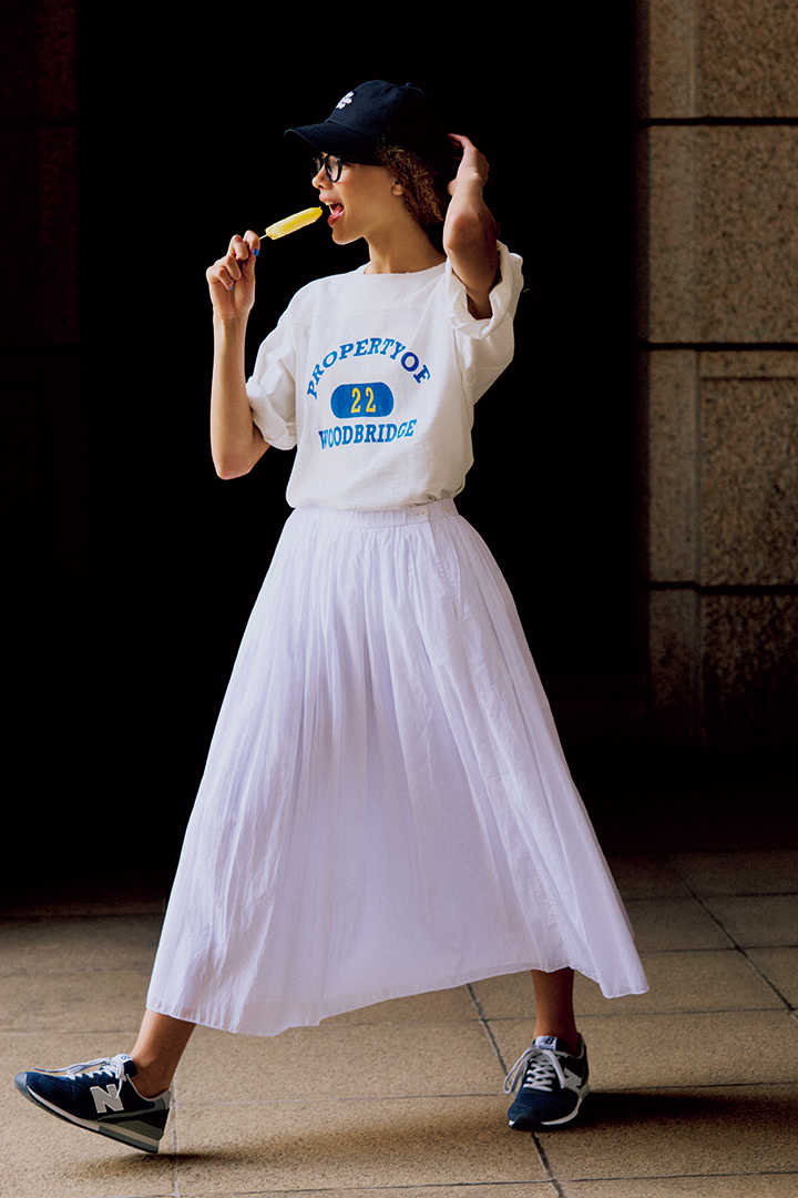 夏のユニフォームとも言える白Tシャツを、カッティングがユニークなデニムスカートで。トップスの絶妙な丈感や、スポーティなスニーカーを合わせた点にセンスが感じられる。