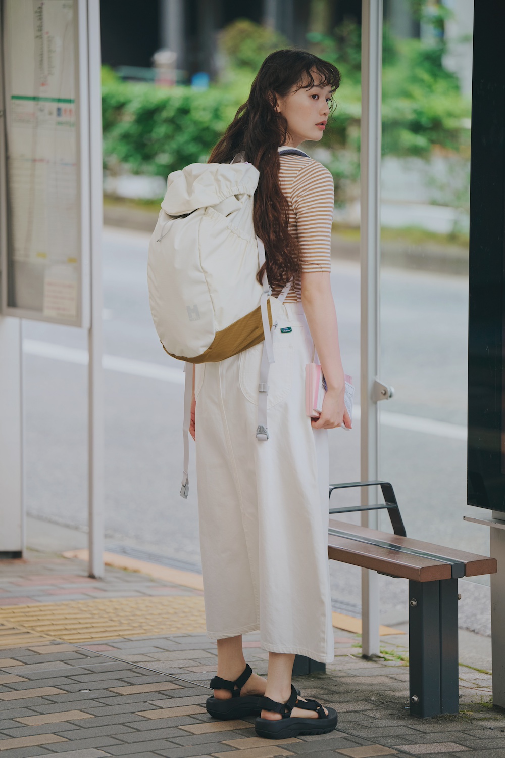 イノセントな白のスカートが本日の主役。懐かしい雰囲気のピッチの細いボーダーTシャツは、ちょっとタイトめなものを選ぶのが正解。さりげなくリュックの配色とリンクさせて、白とベージュで完結したスタイル。サンダルで涼しげな足下に。