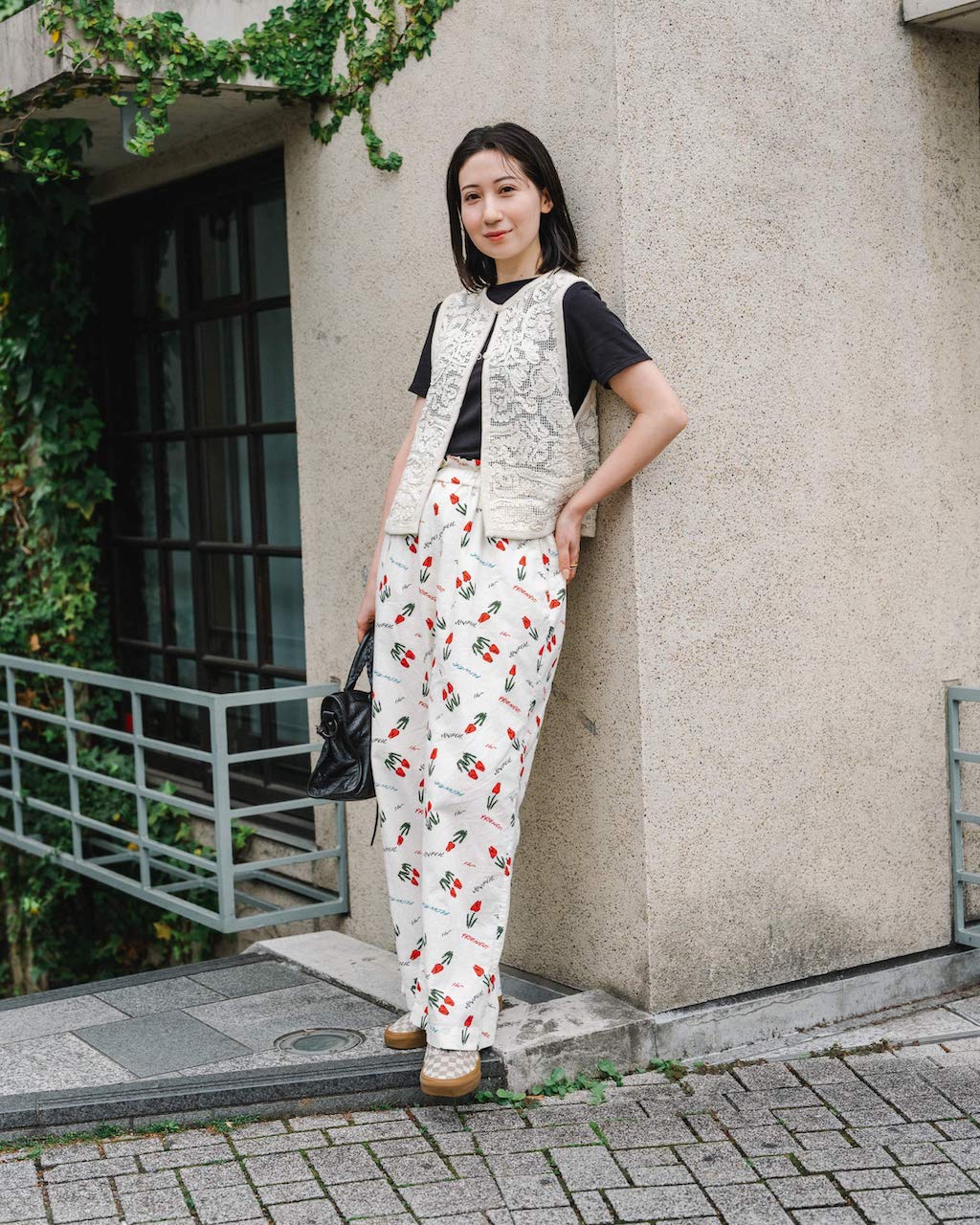 ヴィンテージっぽい雰囲気がお洒落なベストはシンプルTを重ねてカジュアルに寄せて。ガーリーな花柄パンツを合わせた大人可愛いスタイリングで夏をリード。