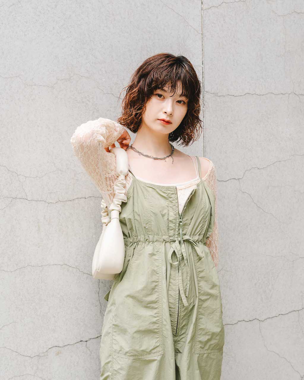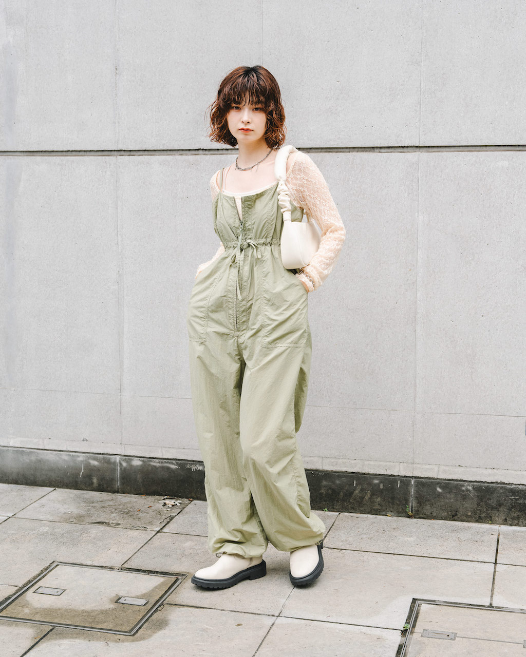 ▶︎カーキのオールインワンに甘めのレースのトップスを合わせて甘辛ミックスコーデ