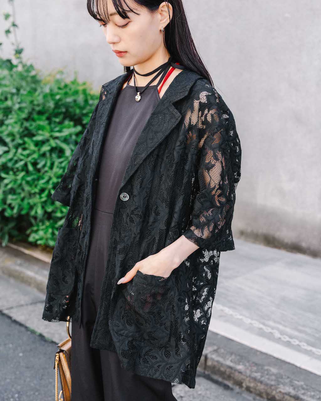 重く見えがちなブラックコーデもシアー素材をMIXすると軽やかな印象に変わる。レースジャケット&メッシュサンダルで、猛暑の夏をお洒落に乗り切ろう。