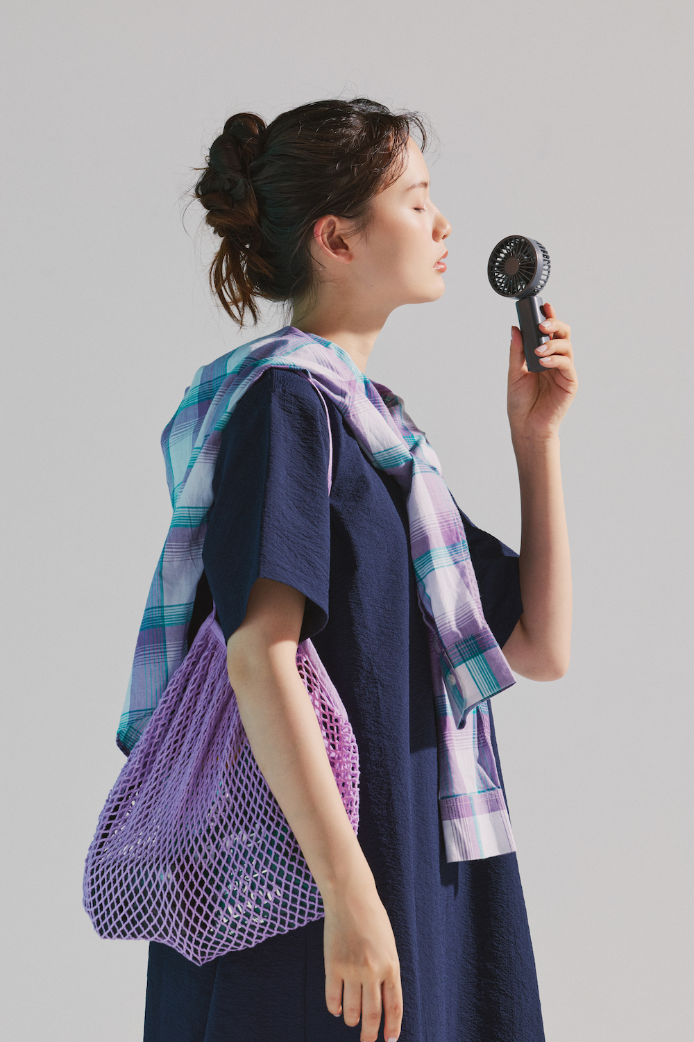 暑くてコーディネートを考えるのも面倒!という日は、ワンピースに頼りましょう。生地表面に凹凸のあるシアサッカー素材は、肌離れがよく軽やかに着こなせて特におすすめ。パープルで揃えたシャツとメッシュバッグ、おまけにハンディファンでアクセントを加えれば、夏感もパーフェクト。足首が見えるローテクスニーカーがグッドバランスです。