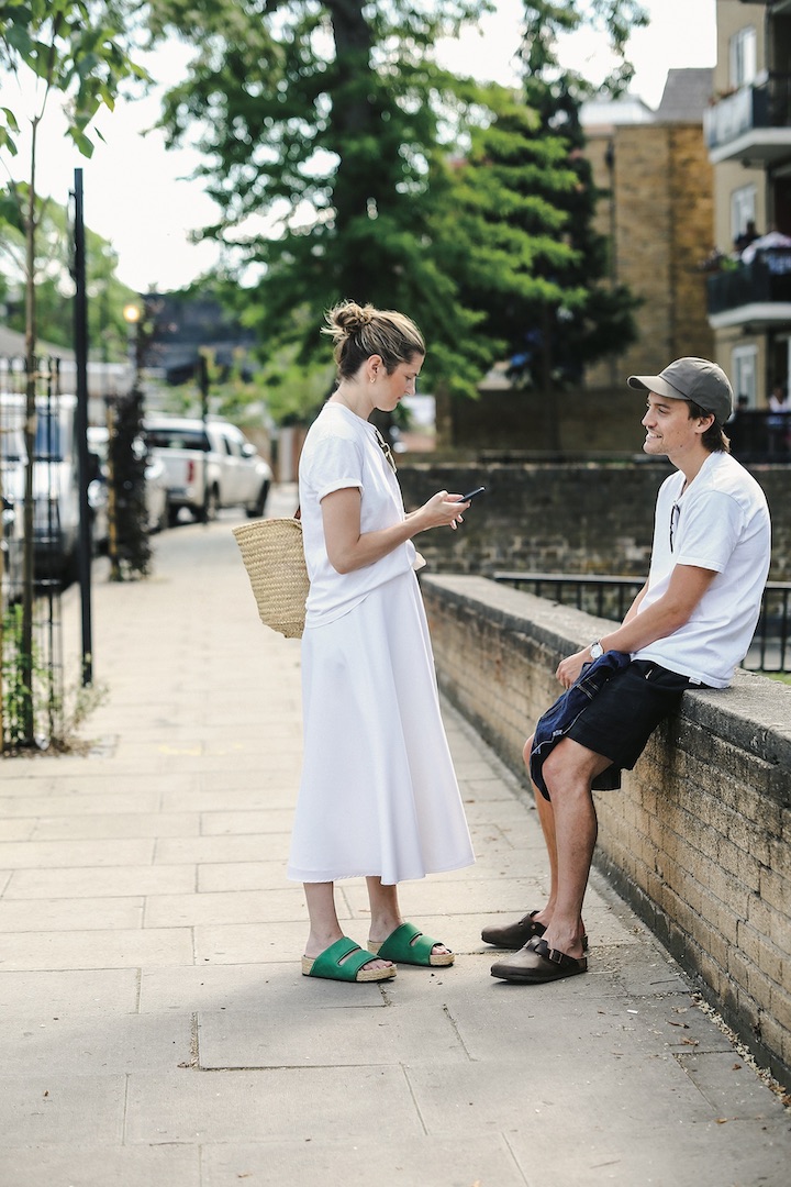 真っ白なTシャツとスカートの清々しいコーディネートに、鮮やかなグリーンのサンダルで小粋なアクセントをオン。夏らしいバスケットバッグを合わせて、軽やかに仕上げて。