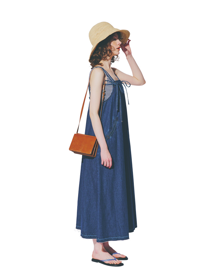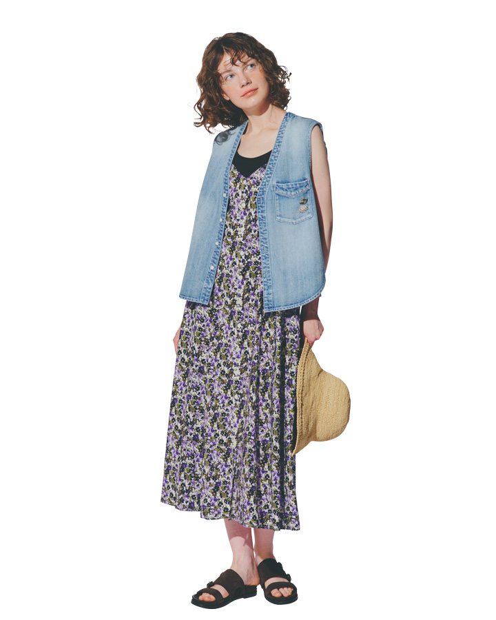 デニムベスト¥22000/RED CARD TOKYO forSALON adam et ropé、ピンバッチ各¥8800/Munqa /SALON adam et ropé(ともにジュンカスタマーセンター)、キャミソール[オンライン限定]¥2990、ワンピース[一部店舗限定]¥11900/ともにGap(ギャップ)、手に持ったハット¥17600/maison de so(il メゾン ド ソイル恵比寿店)、サンダル¥55000/KATIM(カチム)