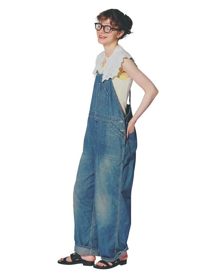 ホワイトのタンクトップ¥9350/SOIL(ビューカリック&フロリック)、イエローのタンクトップ¥2990/Gap(ギャップ)、オーバーオール¥63800/CHIMALA(ジャーナル スタンダードラックス表参道店)、メガネ¥22770/Ray-Ban(ルックスオティカジャパン カスタマーサービス)、つけ襟¥7590/CHILDWOMAN(オクモ)、サンダル¥47300/KATIM(カチム)