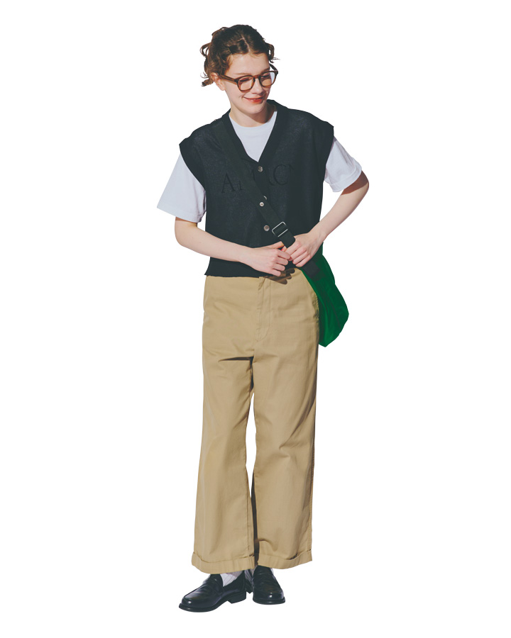 ベスト¥18150/human woman(ヒューマンウーマン)、Tシャツ¥9350/Firsthand × Americana(ファーストハンド)、パンツ¥16280/BEAMS BOY(ビームス ボーイ 原宿)、メガネ¥62810/Oliver Peoples(ルックスオティカジャパン カスタマーサービス)、バッグ¥7480/JULY NINE(メイデン・カンパニー)、ソックス¥4290/HOiSUM(ホイサム)、シューズ¥70400/SANDERS(サンダース ジャパン)