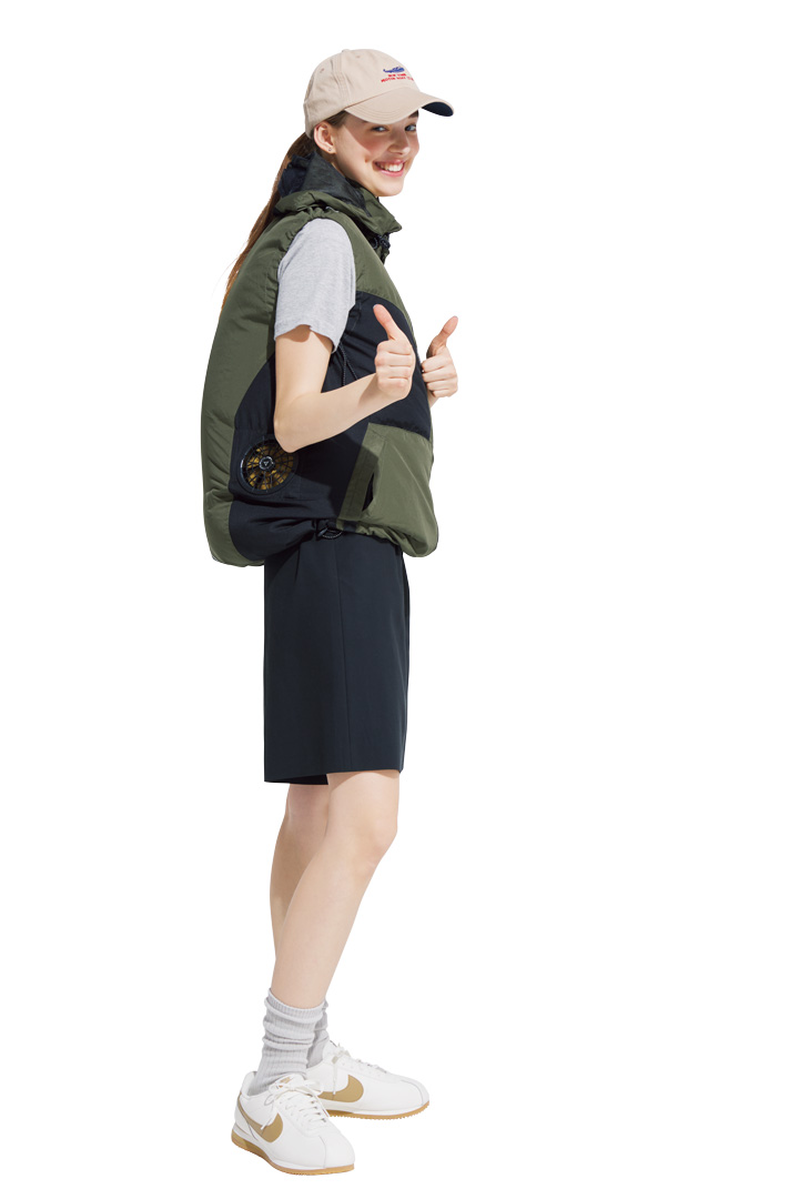 ベスト¥2900、ファン¥5800、バッテリー¥10800/WORKMAN(ワークマン)、Tシャツ¥14300/YAECA(ヤエカ アパートメント ストア)、ショートパンツ¥19800/MACKINTOSHPHILOSOPHY(SANYO SHOKAIカスタマーサポート)、キャップ¥9350/OLD SOLDIER(メイデン・カンパニー)、スニーカー¥11300/NIKESPORTSWEAR(ナイキ カスタマーサービス)、ソックス/スタイリスト私物