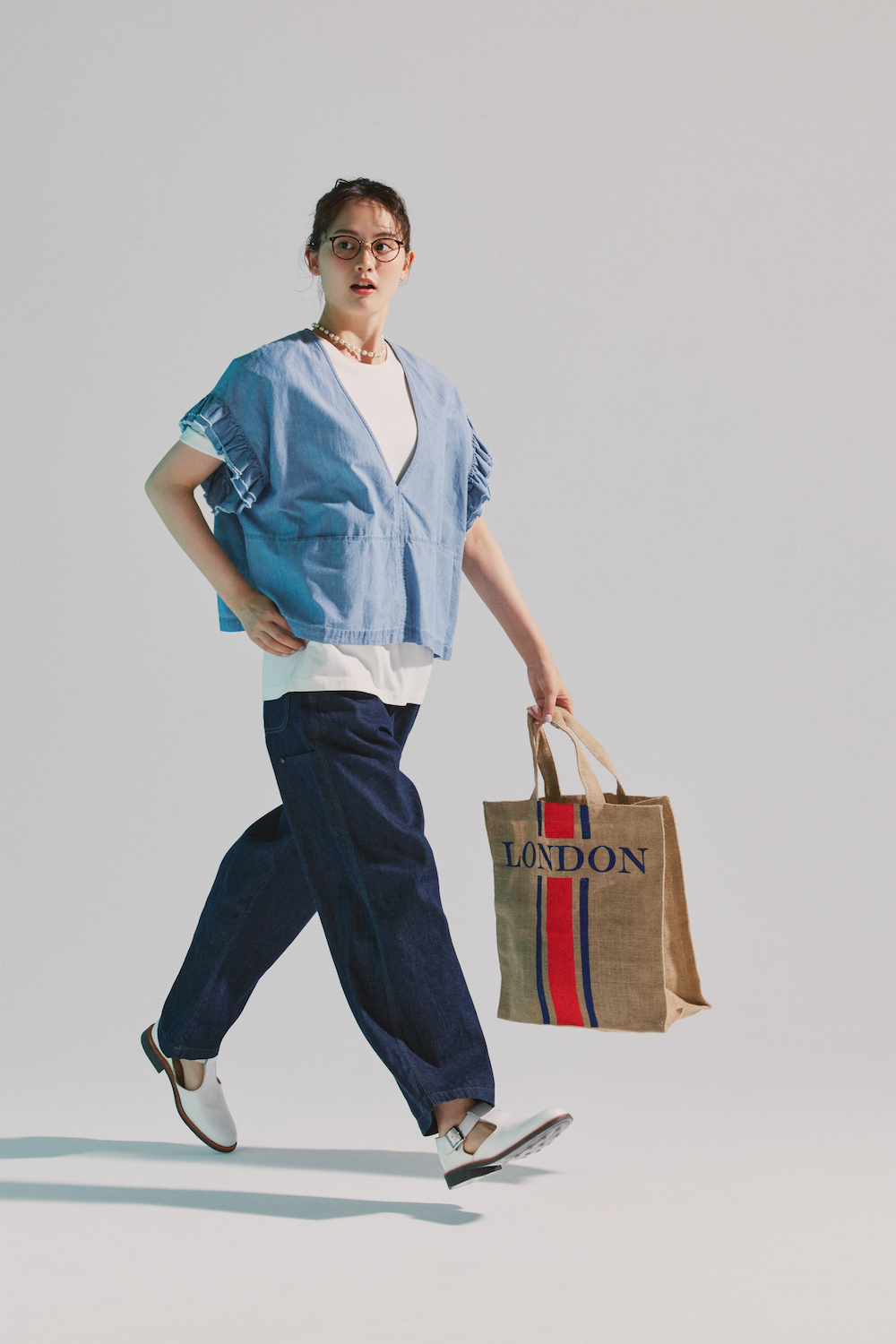 ベスト¥25300/nest Robe(ネストローブ 表参道店)、カットソー¥11550/takes.(シンゾーン ルミネ新宿店)、デニムパンツ¥26400/BLUE BLUE (ハリウッド ランチ マーケット)、メガネ¥48400/EYEVAN(アイヴァン 東京ギャラリー)、ネックレス¥9900/rapiécage(ノンブルアンペール吉祥寺パークストア)、バッグ¥4950/MAISON BENGAL(セムインターナショナル)、シューズ¥67100/SANDERS(サンダース ジャパン)